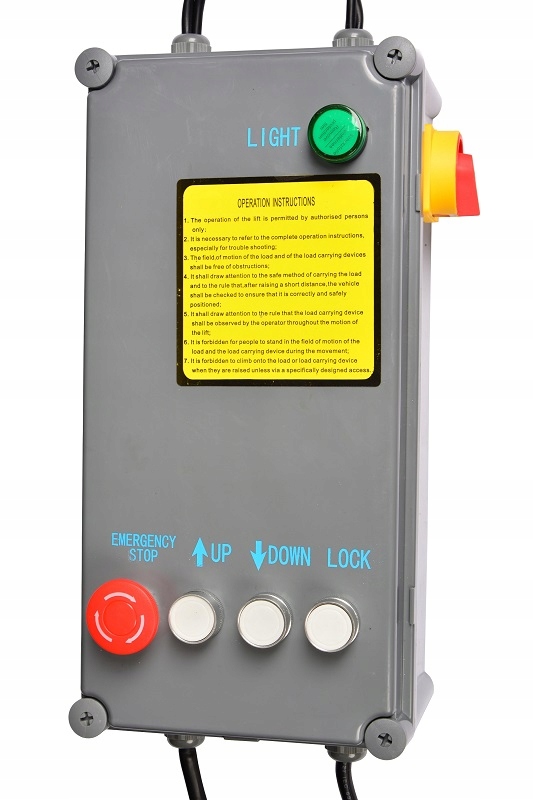 Подъем и опускание автомобиля осуществляется с помощью электрического управления (блок управления), что делает работу подъемника простой и быстрой.