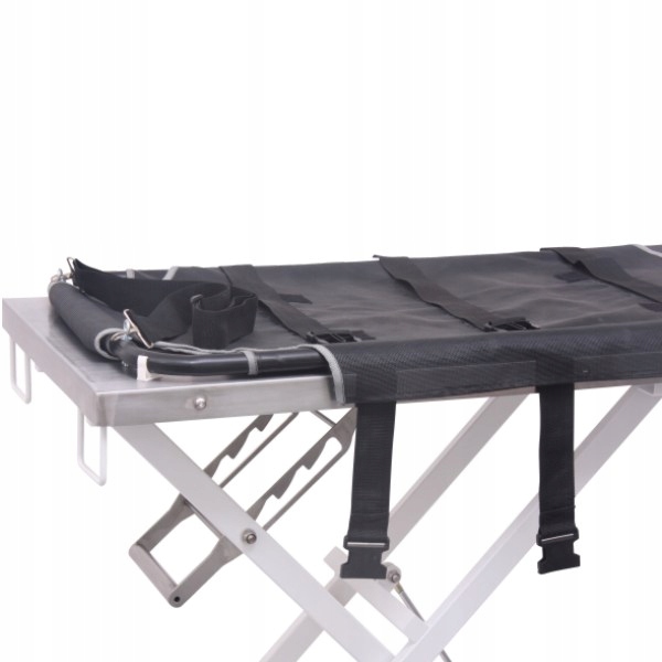 Стол оснащен системой быстрого опускания и подъема. системой одной рукой с замками на разной высоте в зависимости от потребностей, обеспечивающими максимальный комфорт работы ветеринарного врача. Столешница изготовлена из высококачественной нержавеющей стали, устойчивой к коррозии и дезинфицирующим средствам. На столешнице имеются 4 держателя для крепления тканевых подрамников. Носилки дополнительно оснащены ремнями, позволяющими прикрепить животное во время транспортировки.