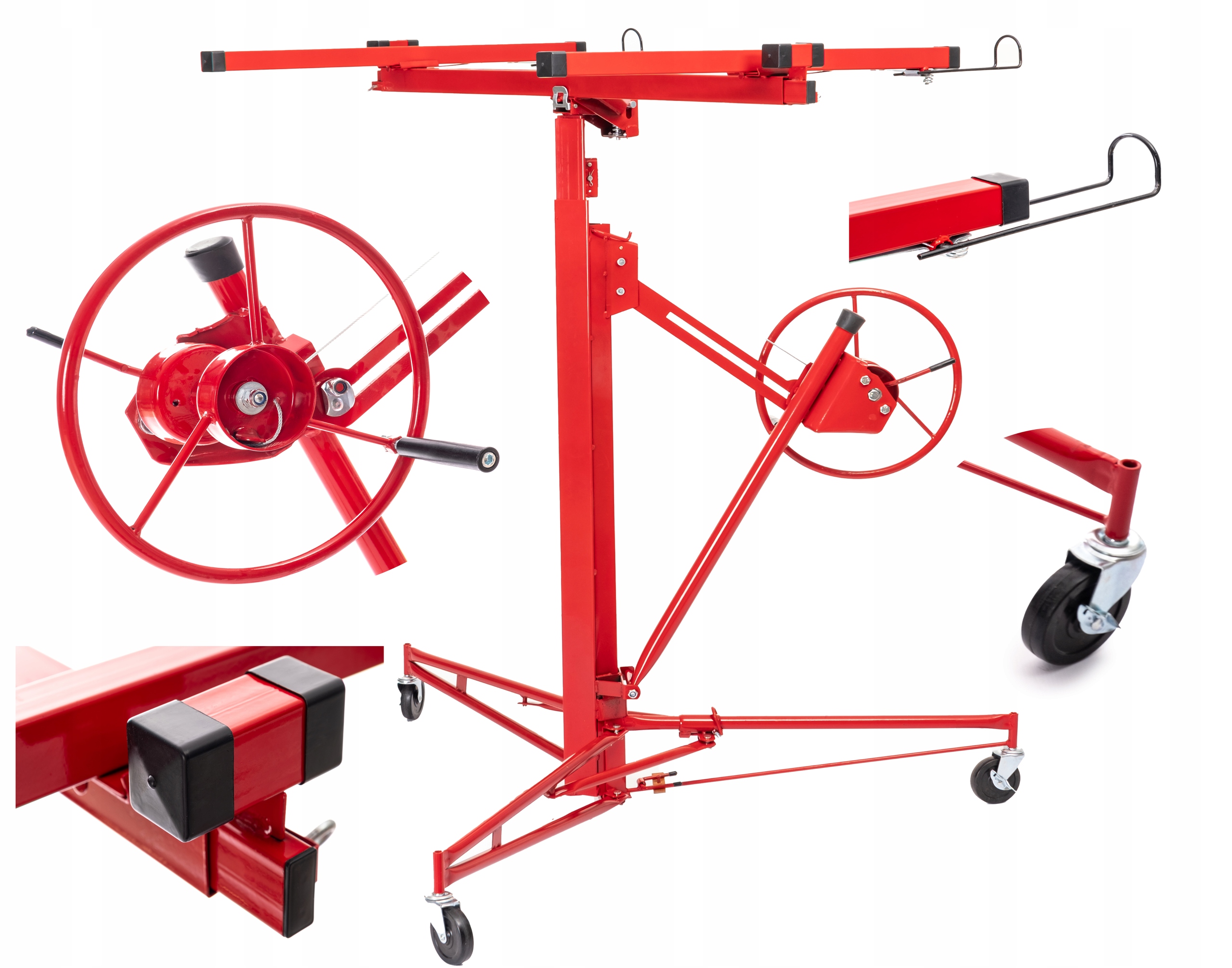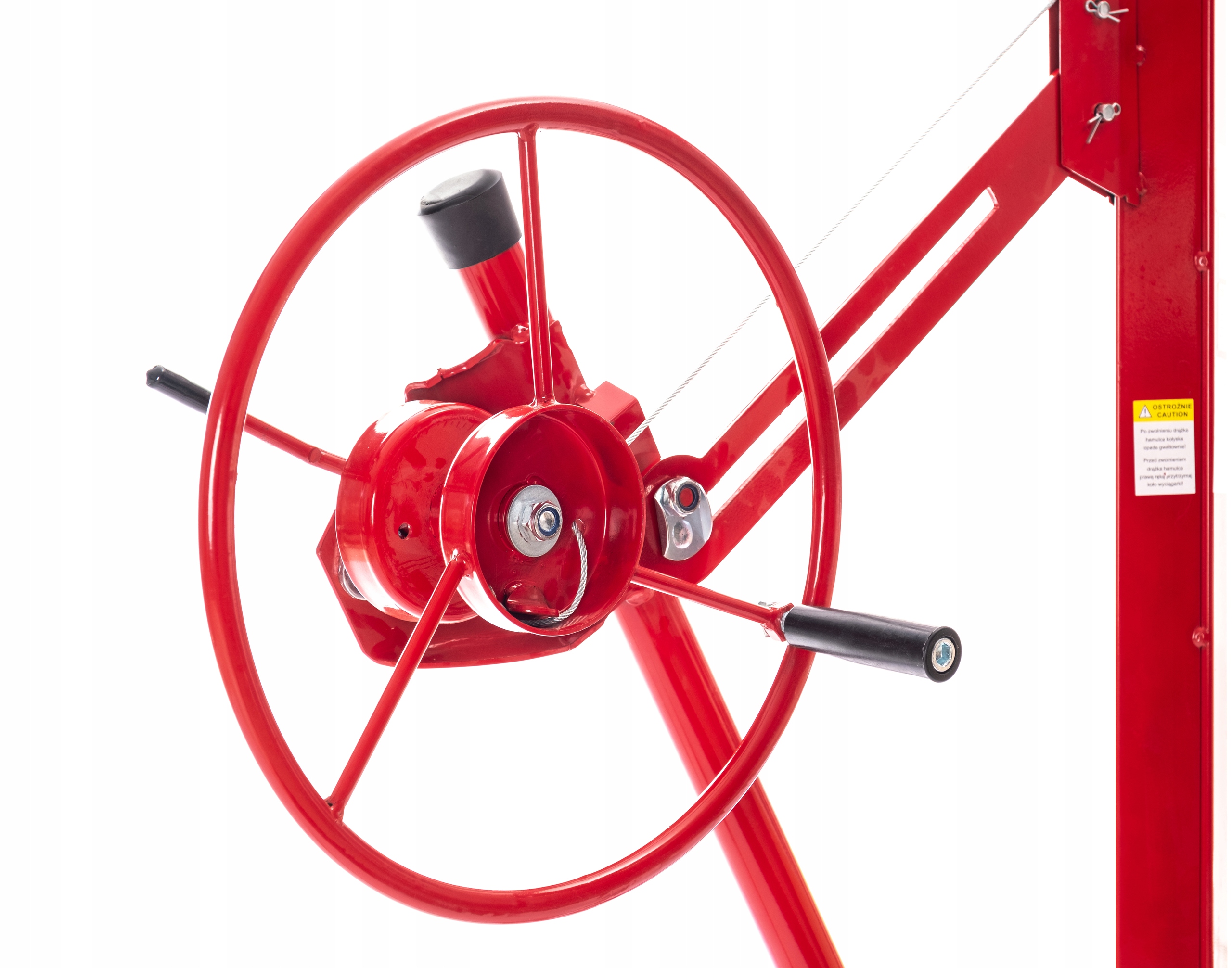 Устройство покрыто защитным красным покрытием. Используемая система шкивов обеспечивает плавное и точное управление подъемом. Замок срабатывает автоматически, > что предотвращает случайное опускание поднятой пластины.