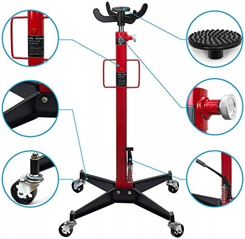 Профессиональный подъемник для подъема коробки передач или двигателя. Подъемник оснащен четырьмя самовыравнивающимися колесами, обеспечивающими легкое и стабильное перемещение. Устройство используется в мастерской, гараже или при других работах, требующих высокой грузоподъемности. Вес поднимается с помощью ножного насоса, а не непрактичного ручного насоса, как более дешевые модели конкурентов.
