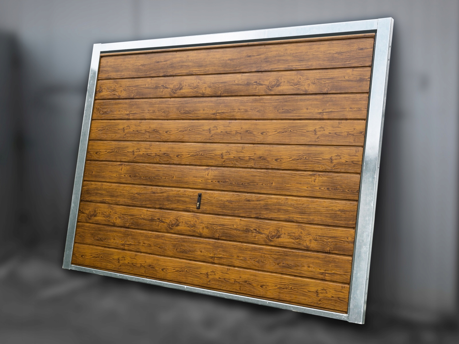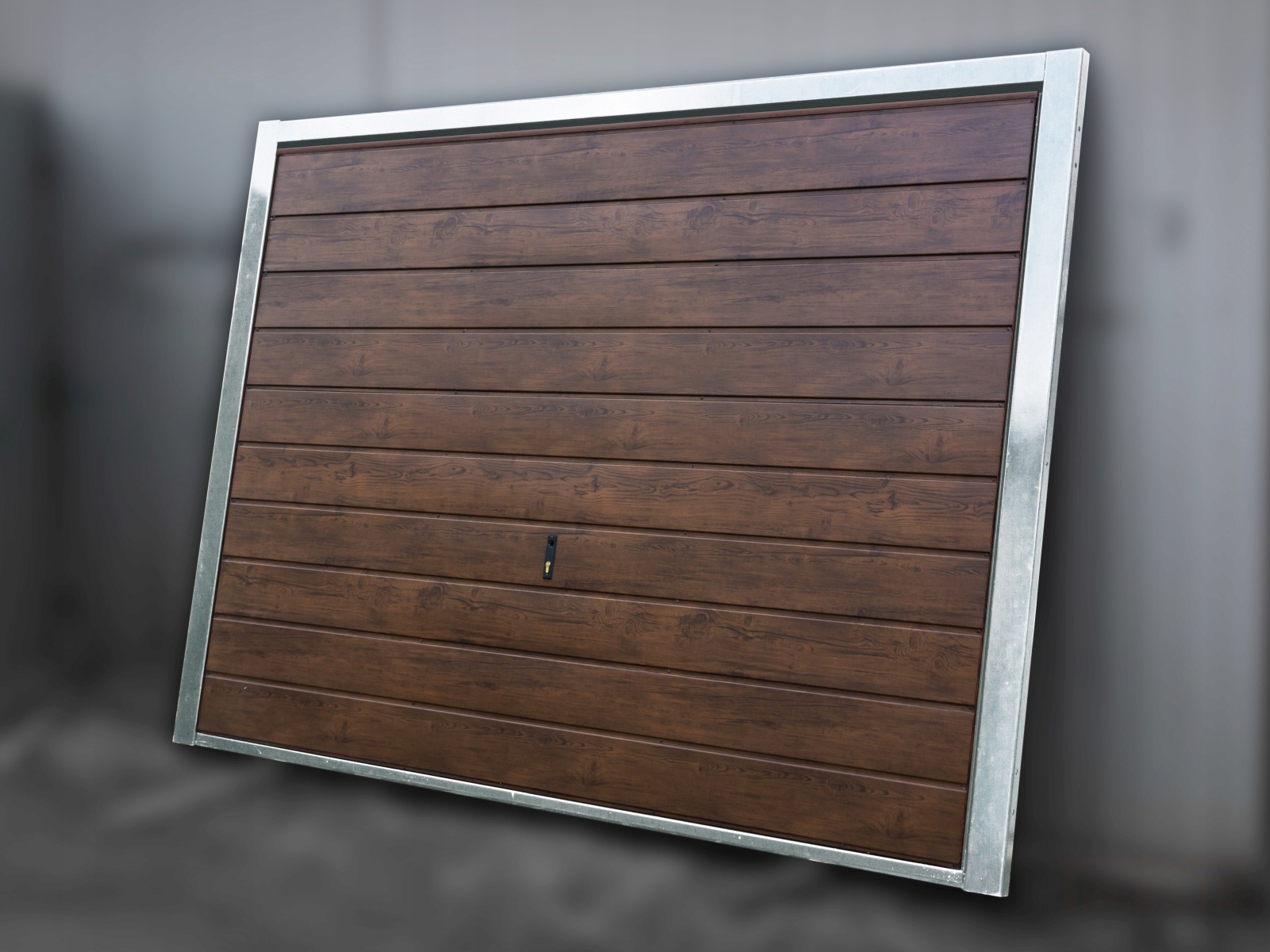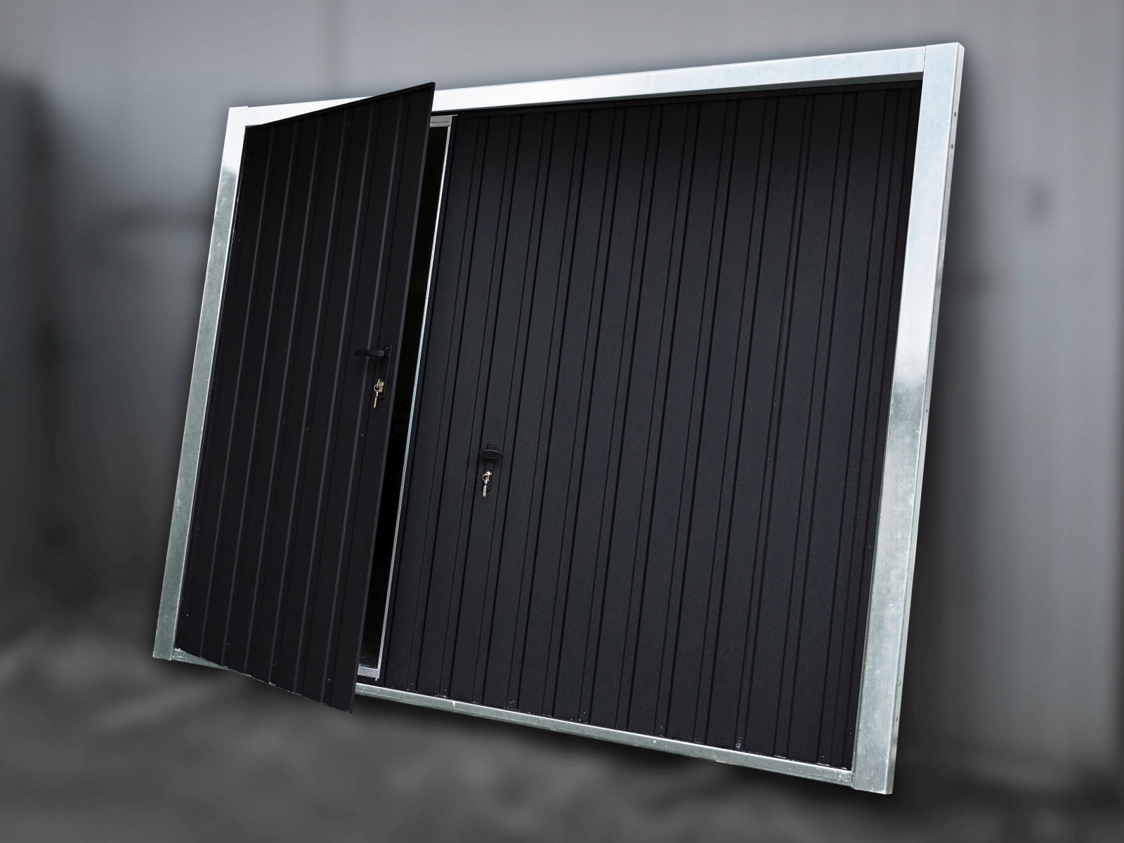 Поворотные ворота матового графитового цвета в широком трапециевидном листовом металле. Его можно использовать во встроенных или отдельно стоящих гаражах.