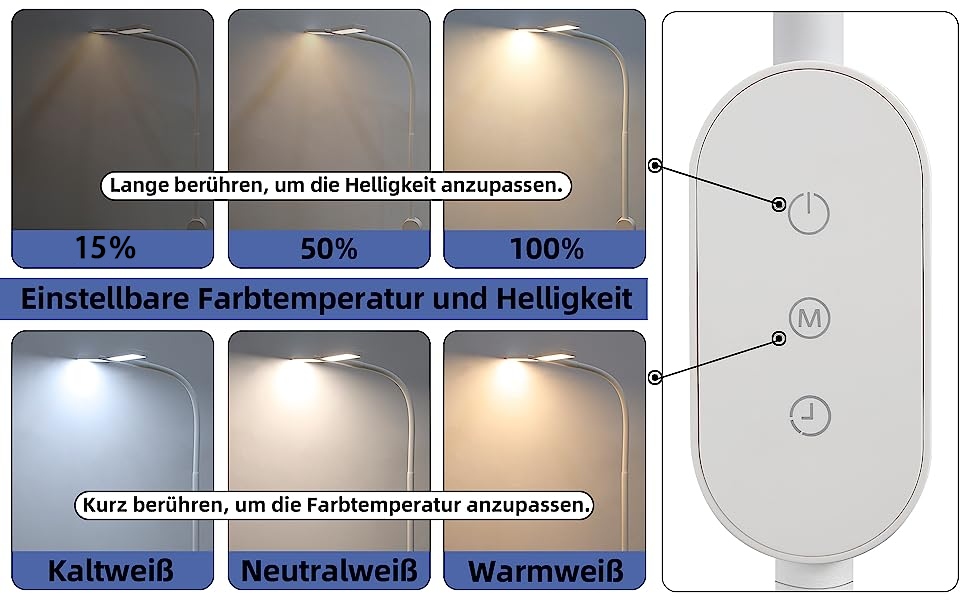 【Регулируемая цветовая температура и яркость】 Пользователи могут переключаться между различными цветовыми температурами (3000–5000K) и яркостью, касаясь функций на панели управления, чтобы адаптироваться к различным условиям для удовлетворения различных потребностей в освещении. Светодиодные торшеры идеально подходят для освещения современных рабочих мест, столов или ламп для чтения в спальнях и гостиных.