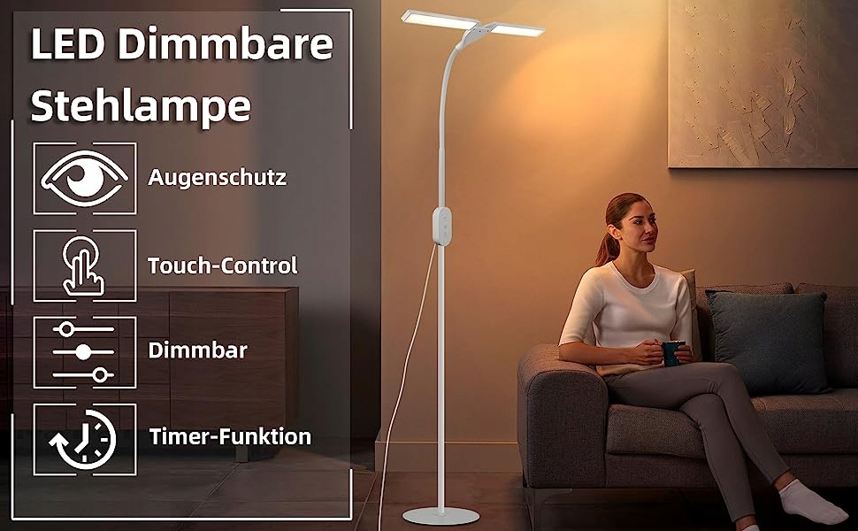 Светодиодный торшер идеально подходит для освещения современных рабочих мест, письменных столов или в качестве лампы для чтения в гостиной. Встроенные светодиоды светят ярко и могут плавно затемняться. Кроме того, с помощью сенсорной панели их можно переключать в разные режимы освещения, включающие разную цветовую температуру. Эти предустановленные сцены отмечены маленьким значком, и доступ к ним можно получить на сенсорной панели одним касанием.