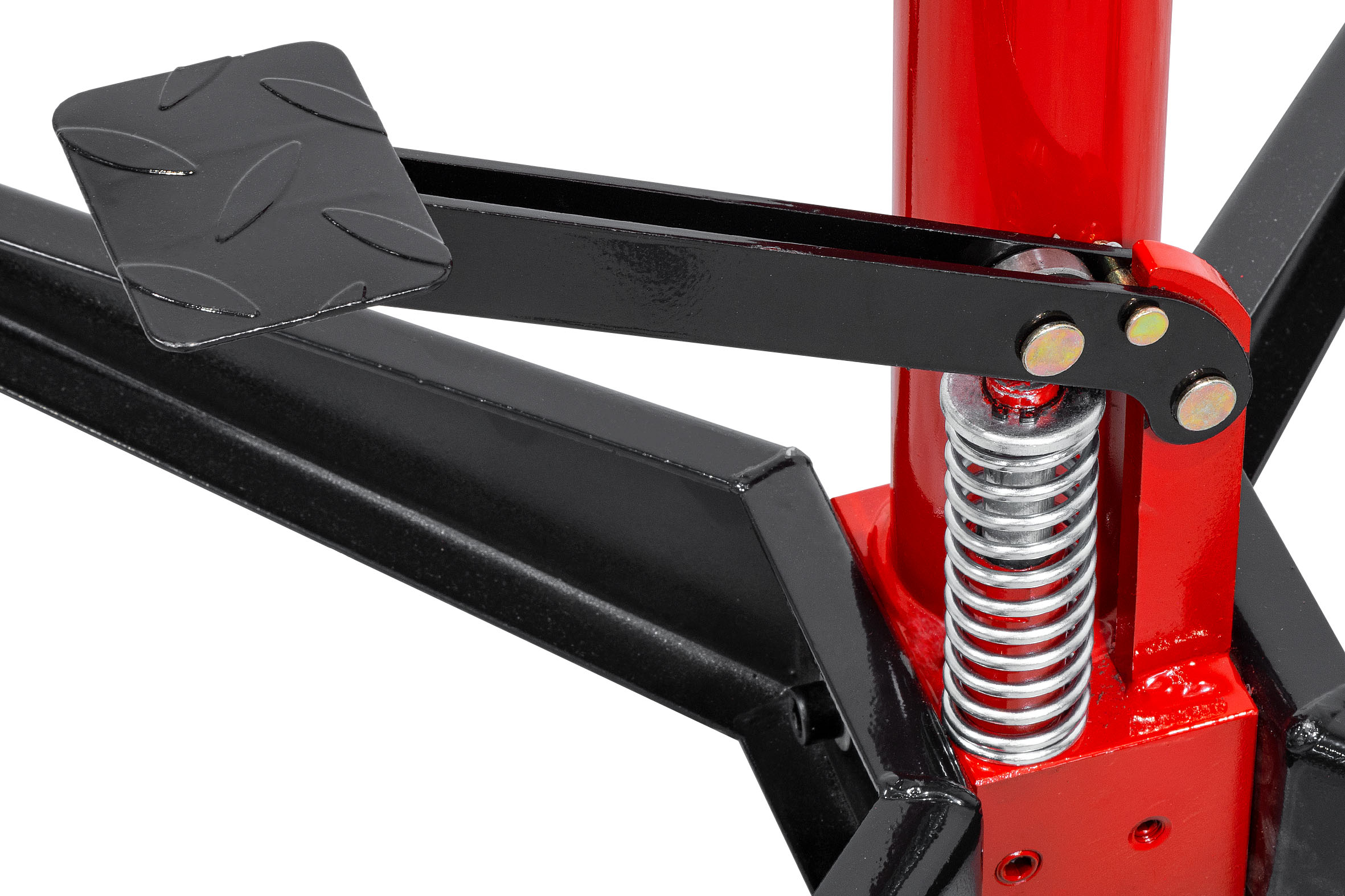 Широкие ножки гарантируют превосходную устойчивость. Безопасное опускание груза возможно благодаря ручке, а прочное седло выдерживает тяжелые элементы.