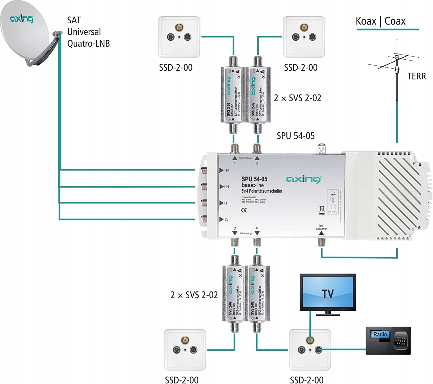 Усилитель сигнала SAT, FM, DVB-T Axing SVS 2-02, 47-2400 МГц, 14-20 дБ