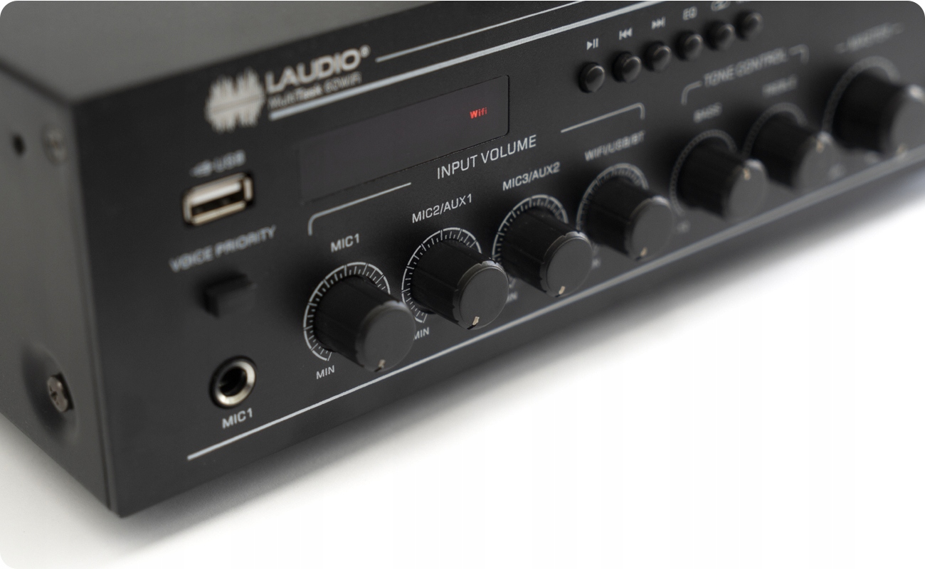 Laudio MultiTask — это микшерный усилитель, предназначенный для успешного использования в общественных звуковых установках малого и среднего размера. Устройство имеет встроенный модуль Wi-Fi и Bluetooth, чтобы максимально упростить использование устройства. Однако, если мы не хотим использовать беспроводную потоковую передачу, в нашем распоряжении есть порт USB.