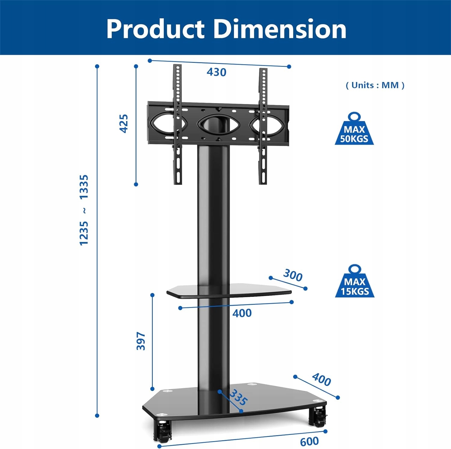 RFIVER Поворотная подставка для телевизора на колесах для телевизора с диагональю 27–65 дюймов, регулируется по высоте, мобильная тележка для телевизора вмещает 50 кг, для плоского и изогнутого экрана, макс. VESA 400 x 400 мм