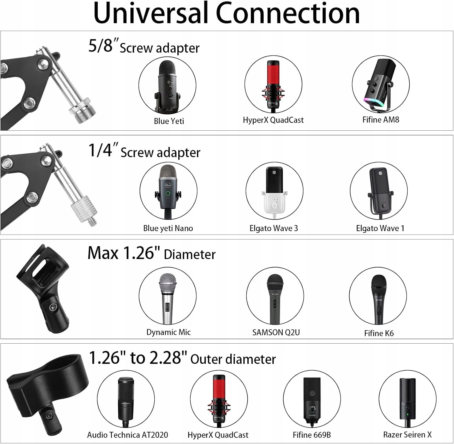 【Применение】В комплект кронштейна для микрофона входят винты от 3/8 до 5/8 дюйма, винты от 3/8 до 1/4 дюйма и адаптер зажима для микрофона, который подходит к большинству микрофонов. Подставка для микрофона идеально подходит для Hyper X QuadCast, Blue Yeti, Blue Yeti Nano, Blue Snowball, Q2U, K669B и большинства других конденсаторных или динамических микрофонов.