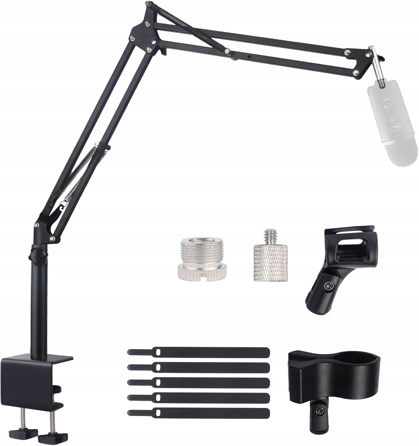 【Полный комплект подставки для микрофона】 В комплект входит все необходимое для студийной записи или вещания: 1 основание настольного зажима, 1 поддерживающий ремень, 1 складной кронштейн, 2 крепления/зажима для микрофона, 2 металлических винта (от 3/8 до 5/8 дюйма и от 3/8 до 1/4 дюйма), 5 кабельных стяжек и 1 руководство по эксплуатации. Кронштейн микрофона складывается, что упрощает переноску и хранение.