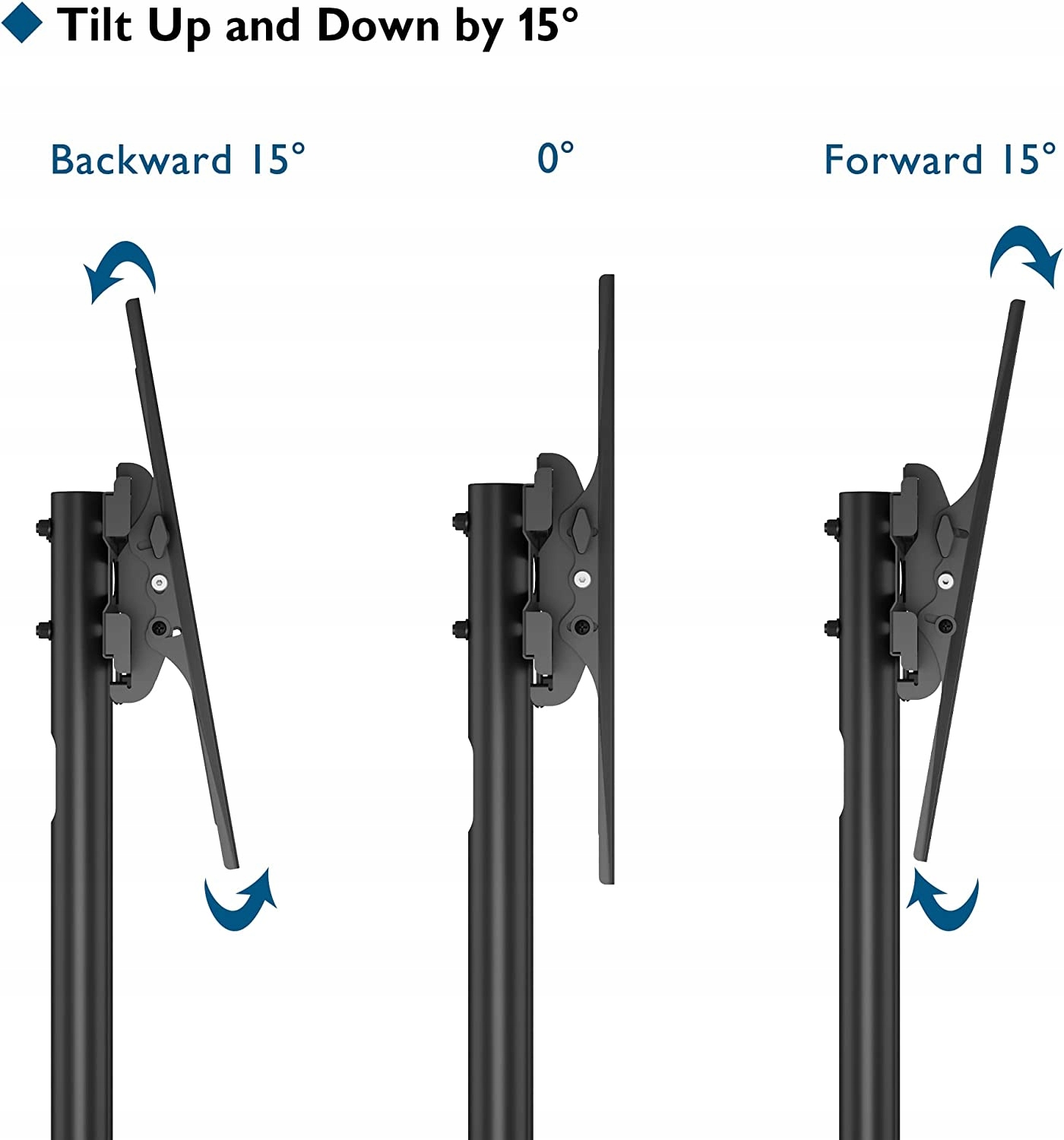 Монтажный кронштейн можно наклонять вверх и вниз на 15 градусов; имеет 8 уровней регулировки высоты от 1016,5 мм до 1517 мм (каждую высоту можно регулировать на 71,5 мм) для обеспечения оптического угла обзора; оснащен прочной медиа-полкой для хранения ноутбука, DVD или игровой системы; полку также можно отрегулировать на любую высоту.