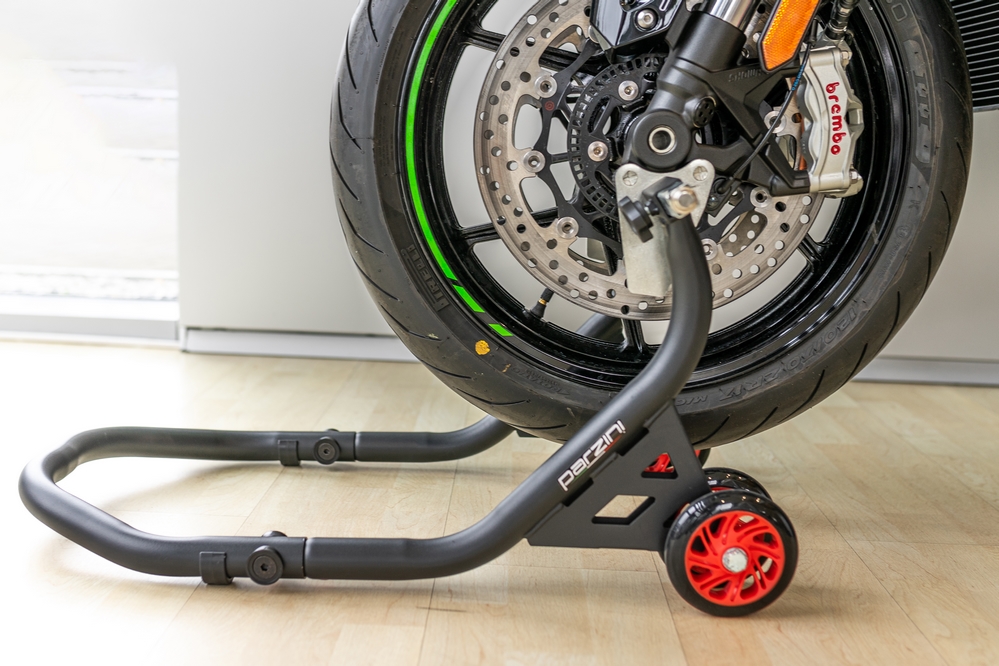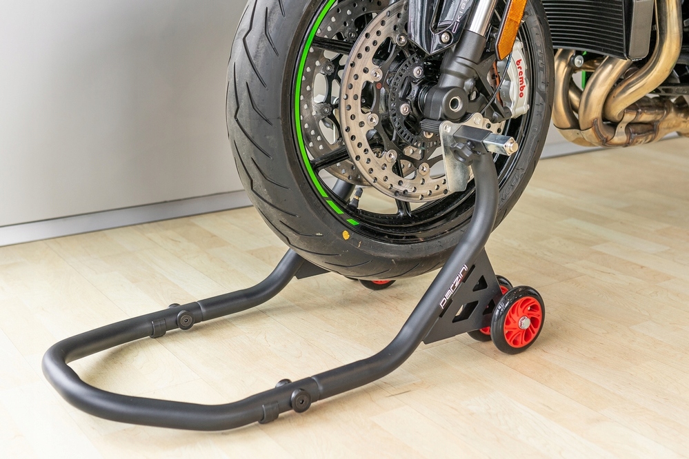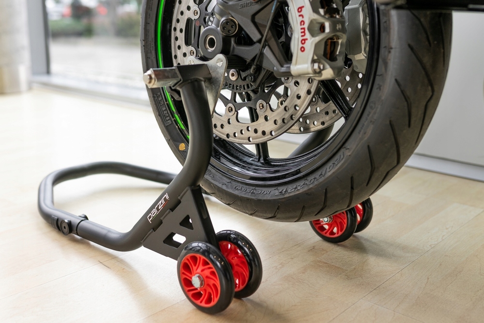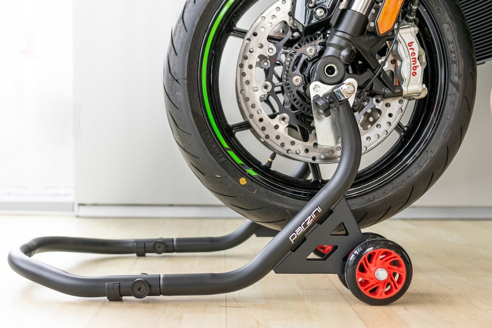 Parzini Motorcycle Lift. Подъемная / мотоциклетная подставка Parzini Strada Pro Front, разработанный для моделей с классической передней трубчатой подвеской - адаптеры с роликами для передней подвески включены в набор. Продукт поставляется и обеспечен для транспорта. Быстрая и интуитивно понятная независимая сборка.