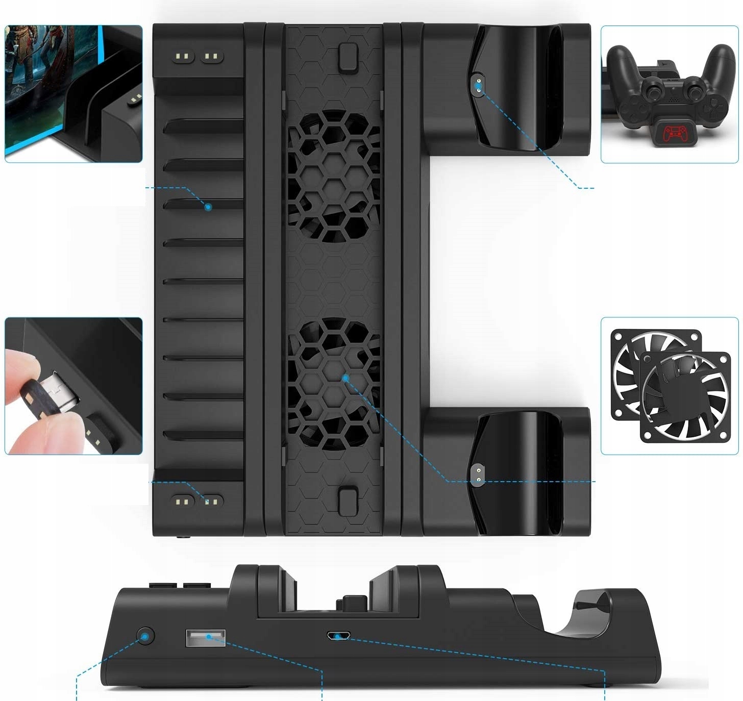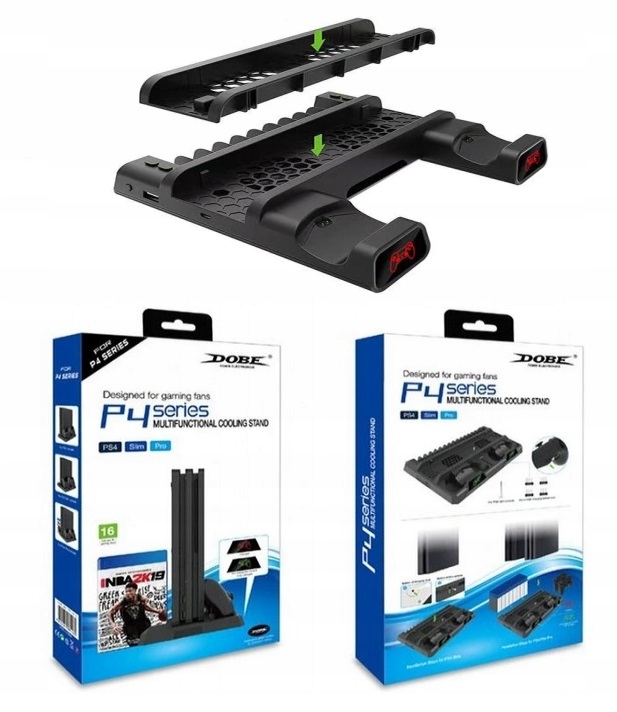 3IN1 Охлаждающий стенд для PlayStation 4, Slim и Pro Dobe - идеальное решение для игроков, которые хотят сохранить свою консоль в оптимальных условиях. Боковая стена, экономя место и обеспечивая лучшую охлаждение благодаря встроенным вентиляторам. Кроме того, подставка оснащена док -станцией для зарядки двух прокладок