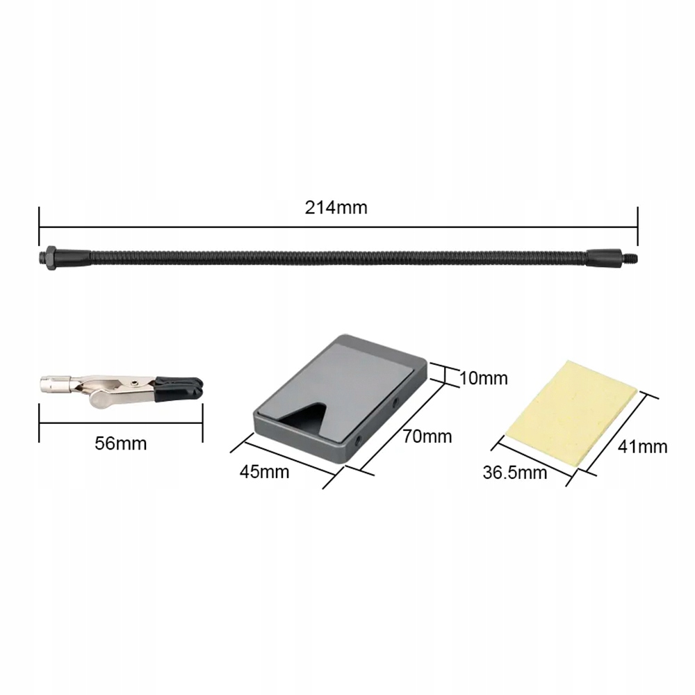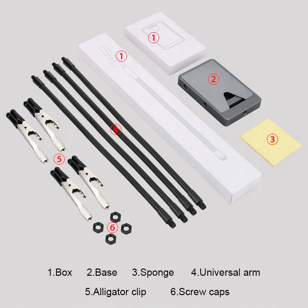 <р>1. Стальное основание — прочное основание с порошковым покрытием, которое имеет соответствующий вес, не опрокидывается и легко переносится. <р>2. Четыре гибких рычага. На каждом рычаге имеется точный зажим типа «крокодил», поворачивающийся на 360 градусов, который позволяет захватывать работу и освобождать руки. <р>3. Четыре зажима «крокодил» — зажимы «крокодил» можно вращать на 360 градусов, работать точно и эффективно, освобождая руки <р>4. Цельная чистящая губка - удаляет остатки припоя, сохраняет компоненты печатной платы в чистоте.