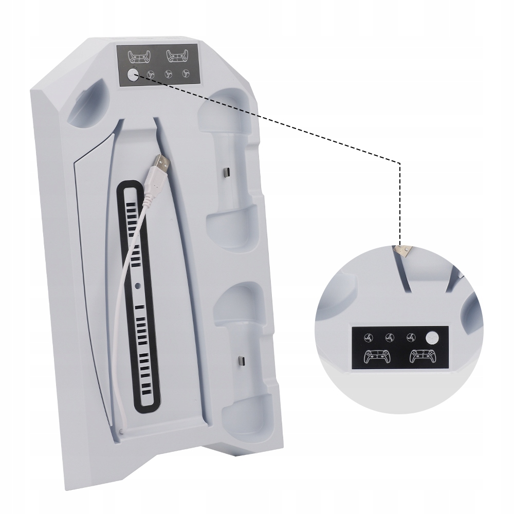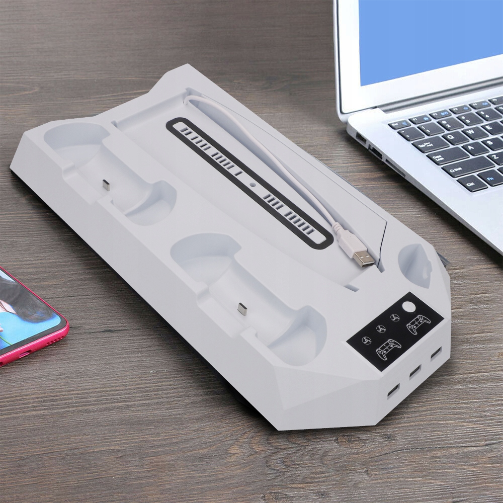Тонкая подставка для охлаждающего вентилятора и зарядное устройство для контроллера PS5 позволяют заряжать два контроллера с помощью одного кабеля, подключенного к консоли PlayStation 5, поэтому вы используете только один порт USB вместо обоих. Легко заряжайте контроллеры DualSense одновременно на одной зарядной станции PS5, а светодиодные индикаторы четко показывают состояние зарядки контроллера PS5 (красный — зарядка; зеленый — полностью заряжен или находится в режиме ожидания).