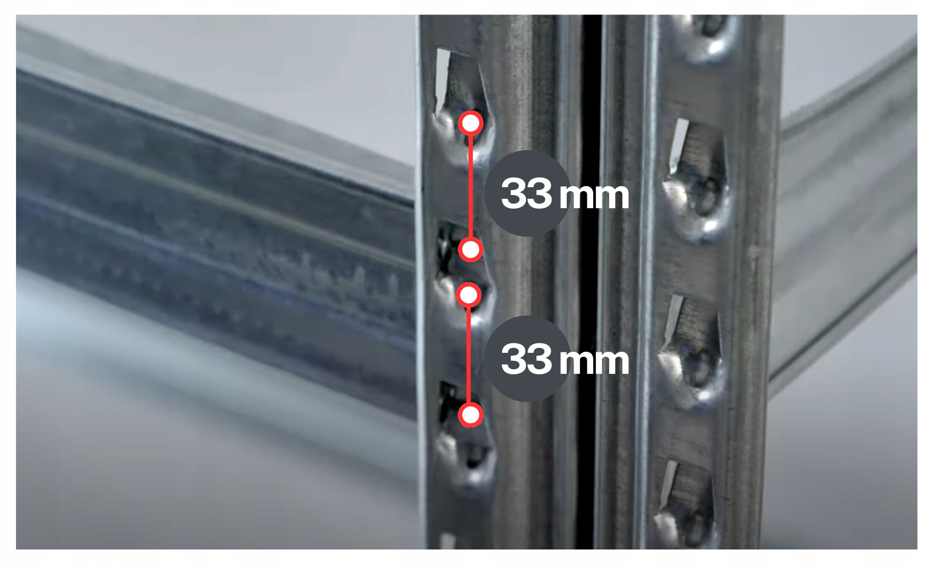 Шаг перфорации каждые 33 мм, что означает, что вы можете самостоятельно определить положение балок – уровень хранения, в зависимости от предпочтений пользователя, при этом максимальное расстояние между уровнями составляет 70 см.
