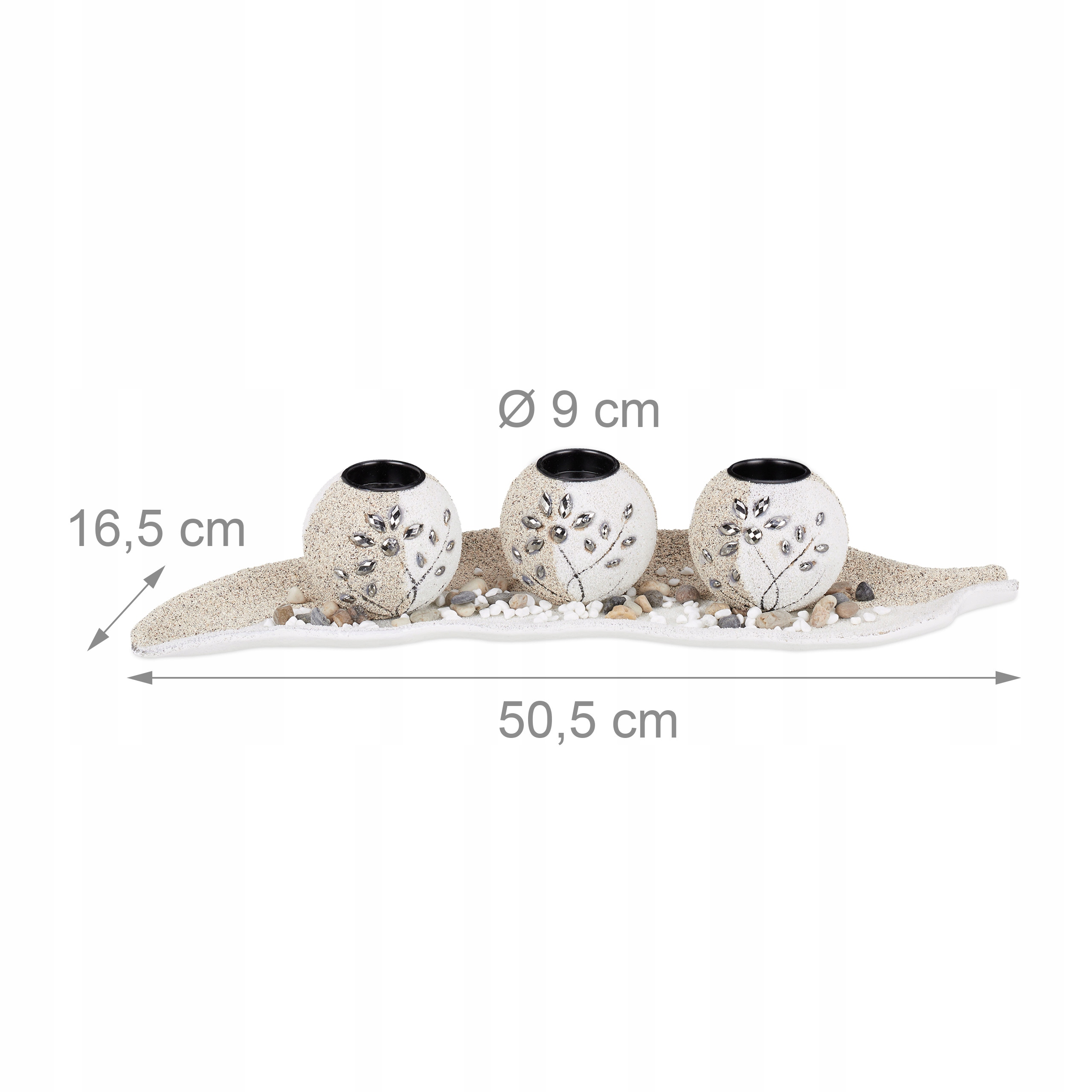 Ищете стильное украшение стола для гостиной? Вам понравится наше украшение из 3 подсвечников на подставке! Песчаная поверхность подсвечников и основания отсылает к пляжу. Натуральные, яркие цвета и декоративные камни дополняют естественный дизайн этого набора. Наши круглые подсвечники украшены красивым растительным узором, который придает этому украшению элегантность. Вы можете разместить эти шариковые подсвечники все вместе на подставке или разместить каждый отдельно. Благодаря нашему элегантному оформлению вы создадите незабываемую атмосферу во время трапезы или романтического вечера. Такое украшение стола также подойдет для летних вечеров на террасе. Наши стильные подсвечники привлекут внимание Ваших гостей и близких.