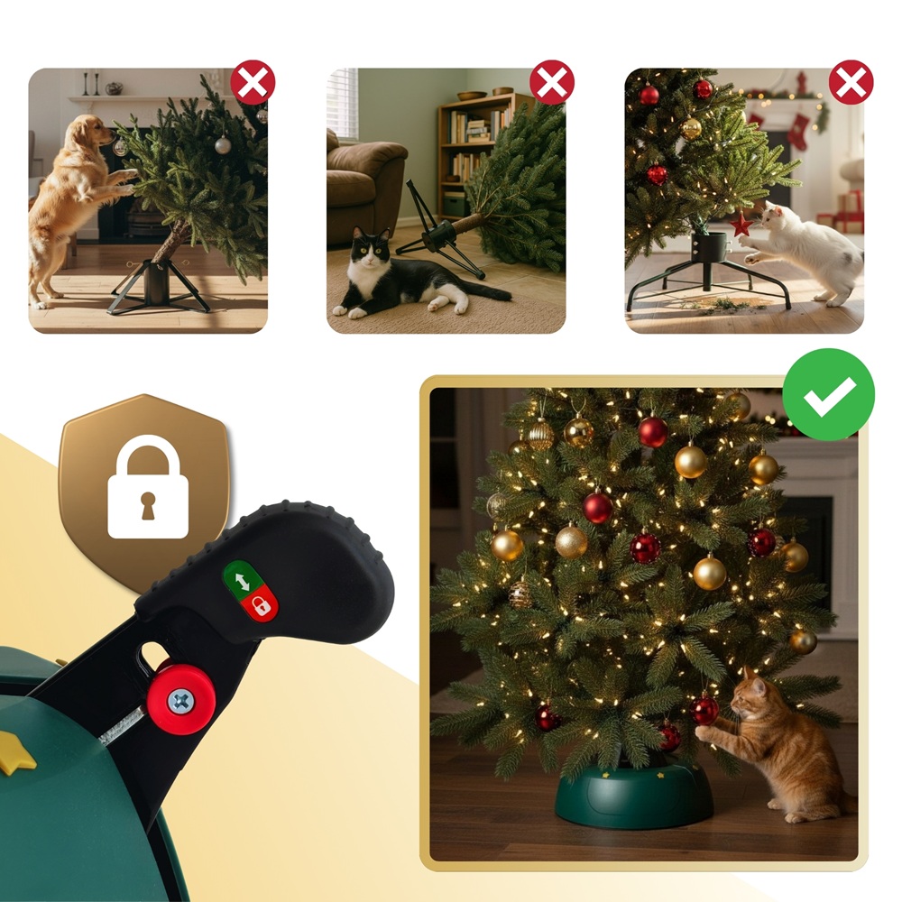 3️⃣ Закрепите: фиксатор защищает от случайного освобождения елки механизм.