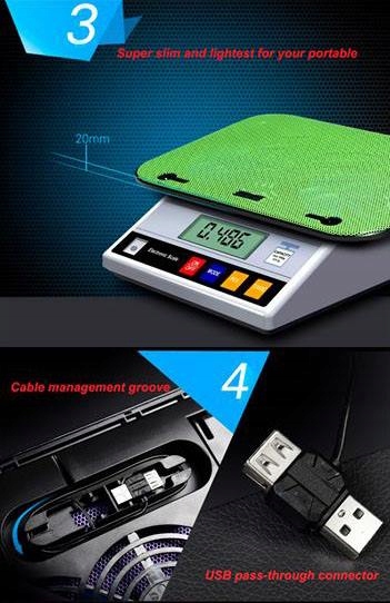 Подставка для ноутбука отличается прежде всего современным внешним видом, устойчивой конструкцией и эффективной системой вентиляторов. Расположение вентиляторов обеспечивает идеальное и эффективное охлаждение ноутбука независимо от расположения нагревающихся компонентов ноутбука (процессор, видеокарта, системы питания, жесткие диски). Широкая совместимость с ноутбуками и ноутбуками с различными размерами матриц 12, 13, 14, 15,6, 16, 17 дюймов. Конструкция позволяет использовать подставку на коленях. Гидравлические подшипники работают очень тихо . Нижняя часть основания имеет дополнительные ножки для увеличения угла наклона и обеспечения максимально возможной эргономичности работы.