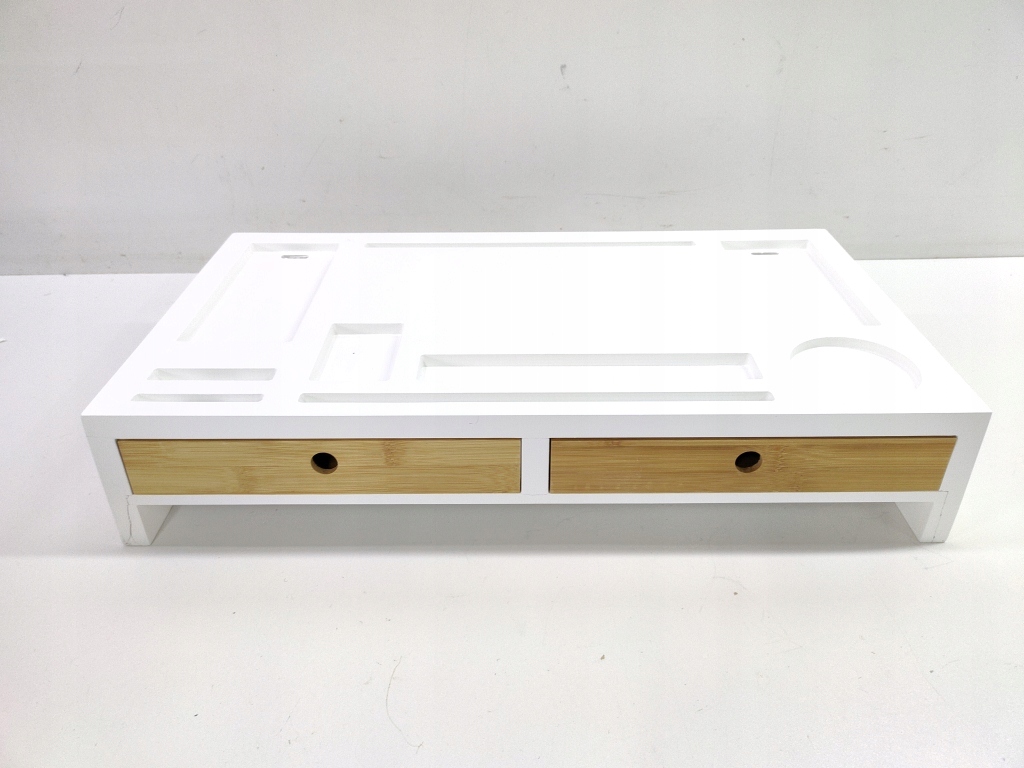 Вас раздражает беспорядок на столе? Наша подставка для монитора поможет вам поддерживать порядок в вашем офисе или домашнем офисе. На нашей полке с 2 ящиками и 9 отделениями найдется место для офисных принадлежностей, таких как ручки, карточки для заметок, документы, а также мобильный телефон и кружка. Во время зарядки мобильного телефона вы можете спрятать его кабель благодаря специальным отверстиям в отсеках. Благодаря нашей подставке для монитора экран находится на уровне правых глаз, что способствует правильному положению сидя.