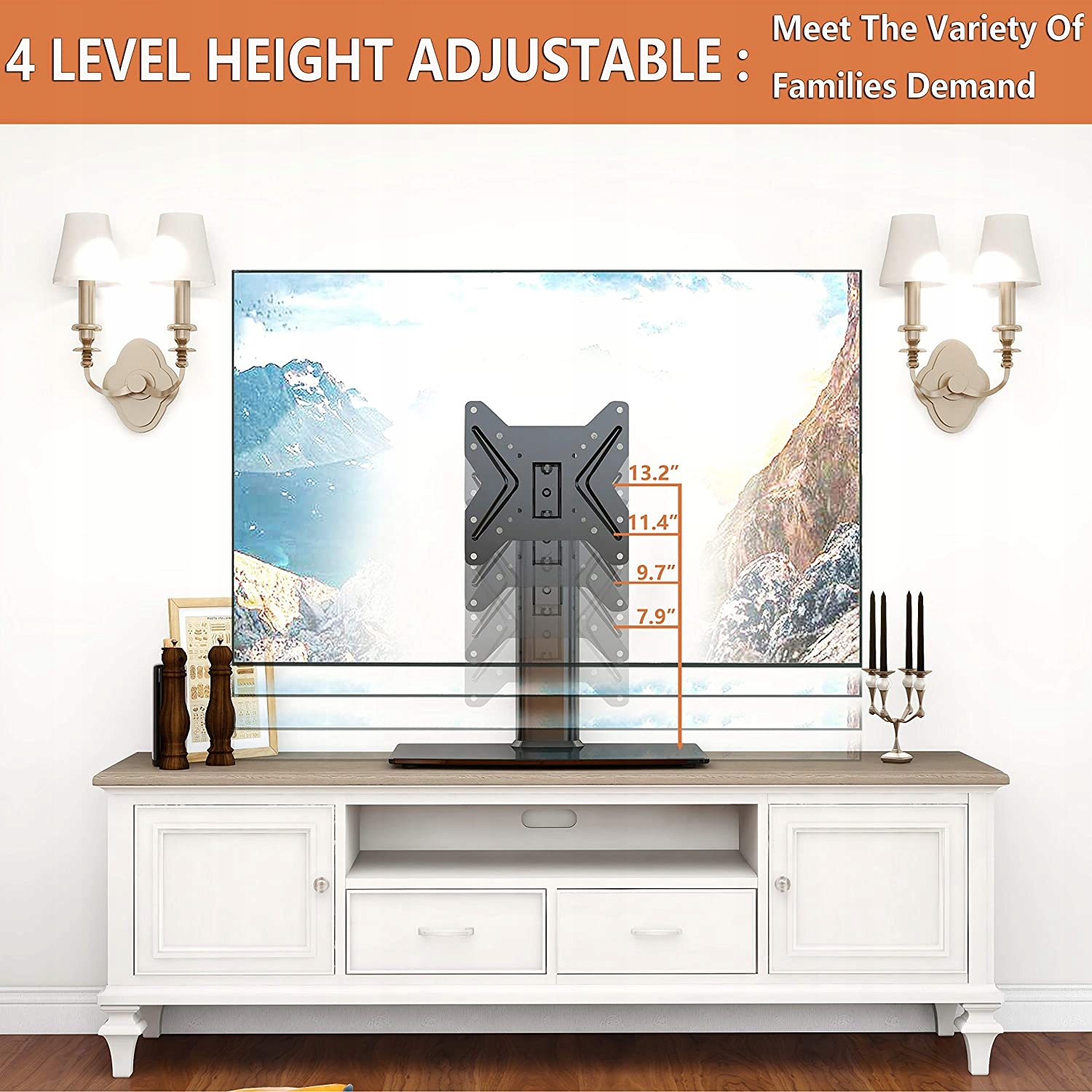 - ФУНКЦИОНАЛЬНАЯ ПОДСТАВКА ДЛЯ ТЕЛЕВИЗОРА С РЕГУЛИРОВКОЙ ВЫСОТЫ И УПРАВЛЕНИЕМ КАБЕЛЕЙ ☞ Мое функциональное крепление для телевизора имеет 4- регулировка высоты уровня для выбора наилучшего пространства, а также встроенный кабельный ввод через порт и сбор беспорядочных кабелей позволяют навести порядок в комнате.