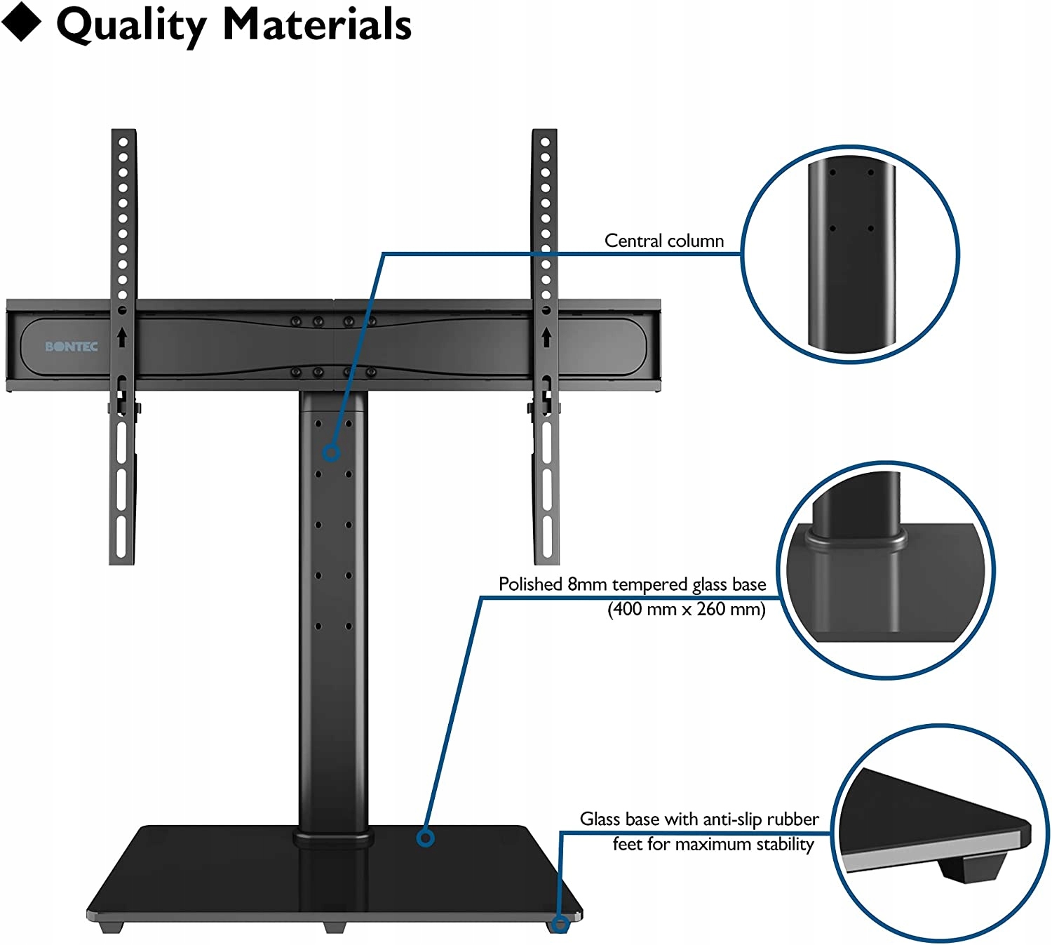 Подставка под телевизор BONTEC, для плоских и изогнутых плазменных телевизоров с диагональю экрана 32-65 дюймов, LCD, LED, OLED, до 45 кг, устойчивая, регулируемая высота , макс. VESA 600 x 400