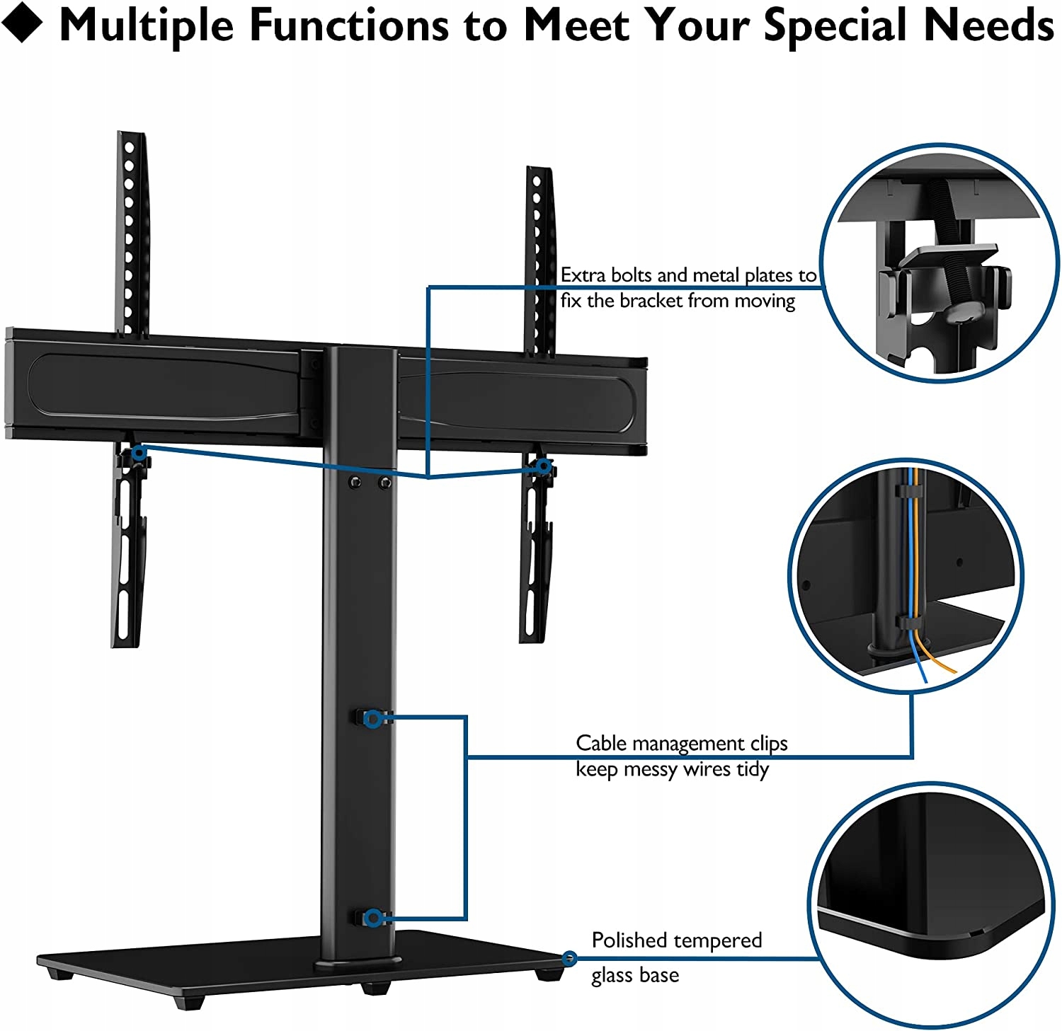 Стабильность - Основной материал - высококачественная холоднокатаная сталь с максимальной грузоподъемностью 45 кг, что обеспечивает Прочная и долговечная подставка для монитора. На этой подставке из закаленного стекла толщиной 8 мм и размерами 400 x 260 мм можно разместить AV-компоненты. Нескользящие резиновые ножкизащищают от царапин.