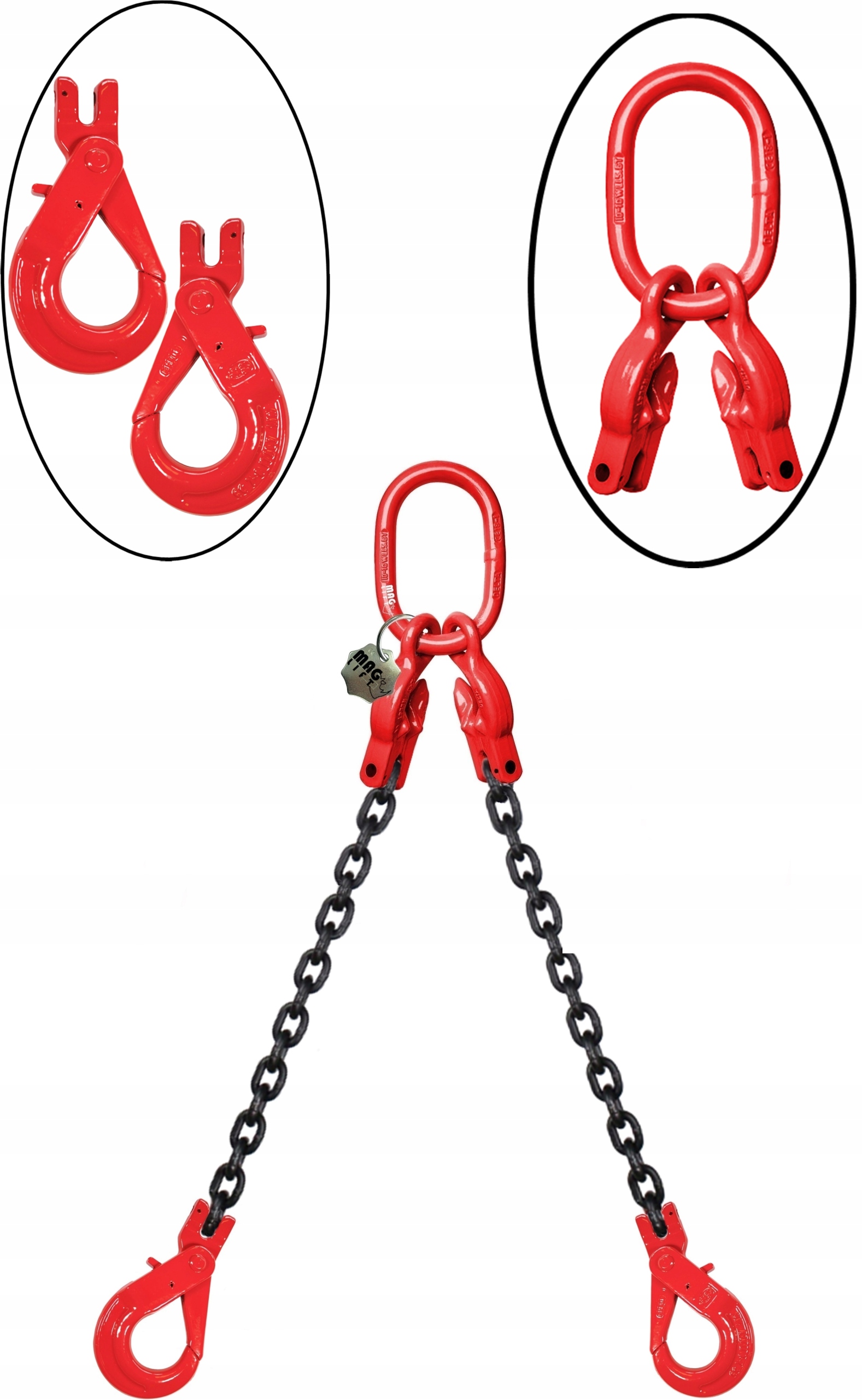 Двухветвевой цепной строп с составным звеном с укорачивающими крючками на концах безопасных крючков - DOR: 1,6 т/1600 кг