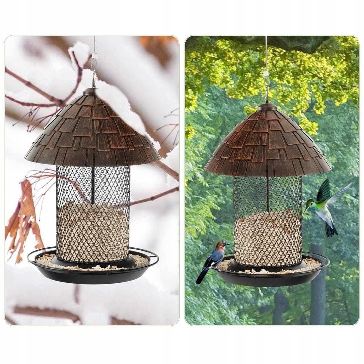 На все времена: подвесная кормушка для птиц, оснащенная большой крышей, защитит пищу в дождливые дни. Кроме того, крыша изготовлена из высококачественной смолы, устойчивой к погодным условиям и трещинам, что обеспечивает долговечность при любых погодных условиях.