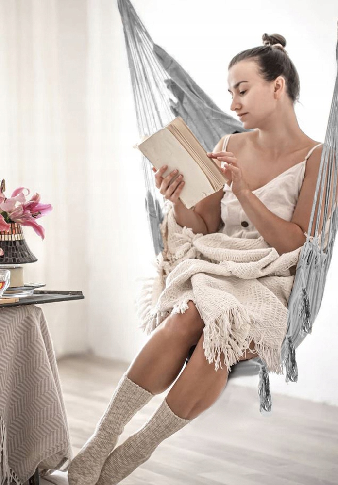 - Прочный материал - 65 % хлопок обеспечивает правильную вентиляцию , что влияет на комфорт использования подвесного кресла даже в жаркие дни . 35% полиэфирной примеси несет ответственность за прочность сиденья. Сплошной монтажный круг соединен с прочными веревками , равномерно распределенными по бокам гамака над деревянным баром. Этот дизайн позволяет легко повесить , а также гамак хорошо сбалансирован и стабильный . Набор -, чтобы обеспечить вам максимальный комфорт во время отдыха , набор включает в себя две удобные подушки, которые будут мягкой поддержкой во время расслабления. Деревянная перекладка - благодаря тому факту, что у гамака есть деревянный бар, обеспечивает комфортное отношение во время отдыха. вы можете свободно читать в нем и наблюдать окружающую среду . Постоянно установлен в саду, на террасе или в комнате