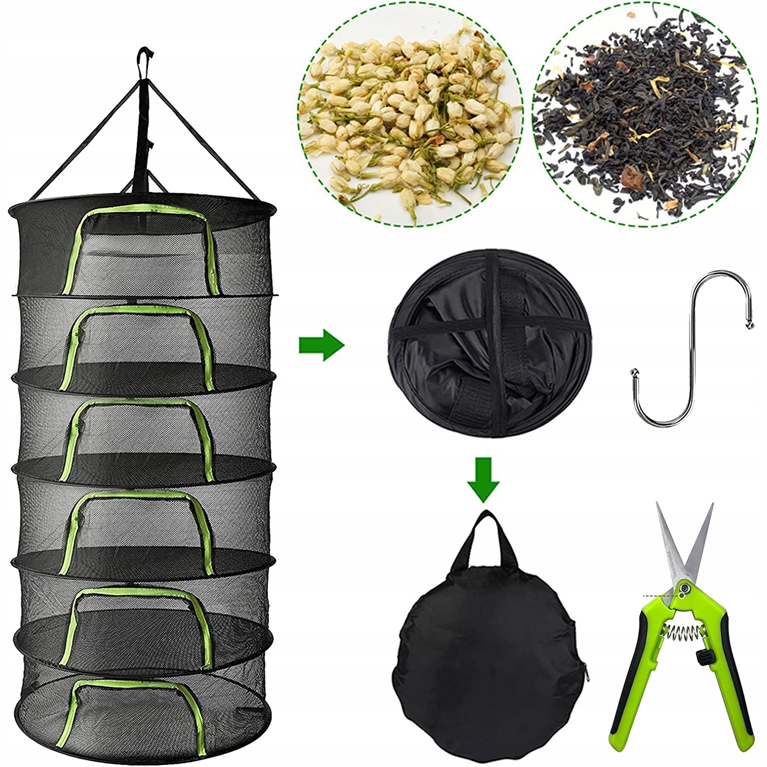 🍀 【6 слоев хранения】 Стойка для сушки трав имеет 6-слойную структуру, диаметр составляет 60 см/23,4 дюйма, а высота каждого слоя составляет 20 см/7,8 дюйма. Каждый слой имеет огромное пространство для хранения, он может одновременно сушить множество растений и трав. Кроме того, сетка для сушки трав позволяет складывать, удобно хранить и переносить ее.
