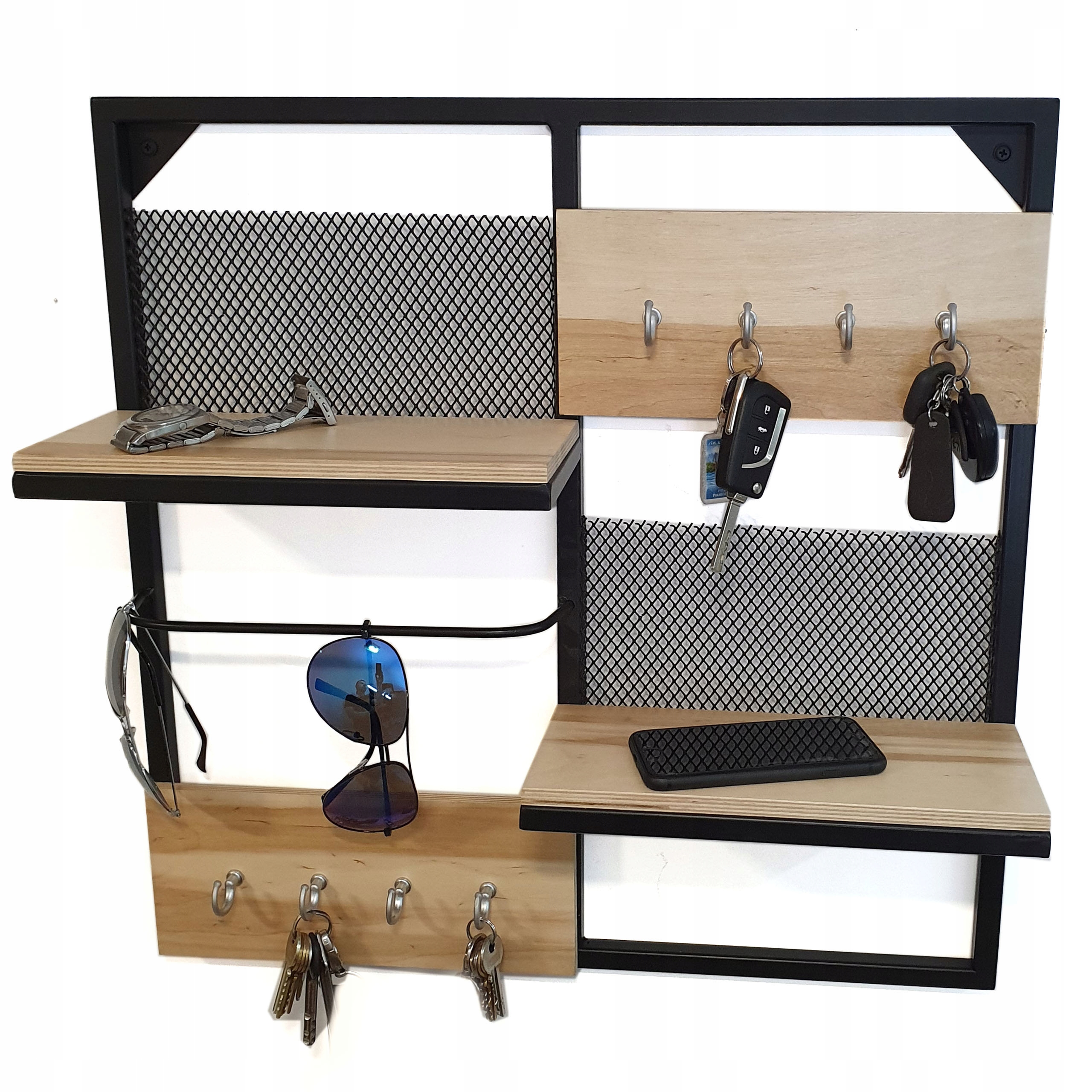 Современная, функциональная, настенная полка для прихожей. Металлический каркас идеально впишется в сырое помещение, а мотив светлого дерева, из которого изготовлены полки, ненавязчиво согреет интерьер. Прочная полка с крючками для ключей, элементом для подвешивания очков и двумя полками для мелочей. Полка вдохновлена индустриальным стилем.