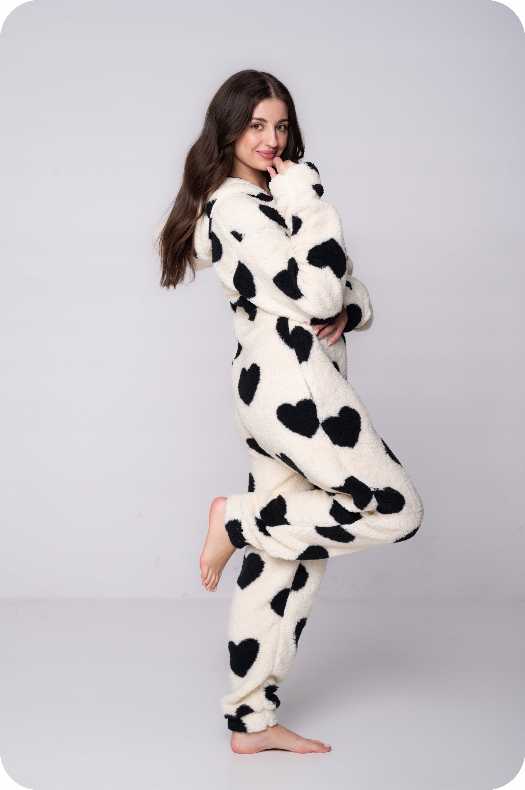 Комбинезон-пижама кигуруми ONESIE для взрослых — белый с черными сердечками ⭐⭐⭐⭐⭐