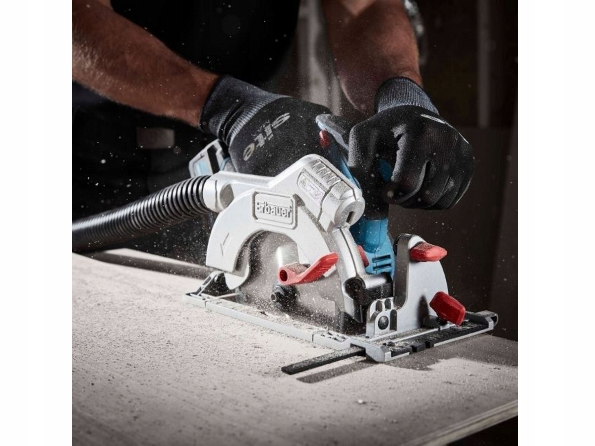 Циркулярная пила Erbauer оснащена лазерной направляющей, которая облегчит выполнение точных пропилов.