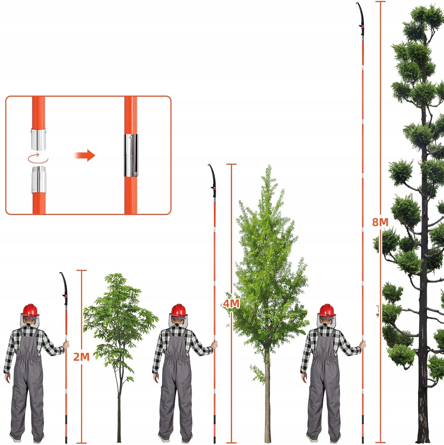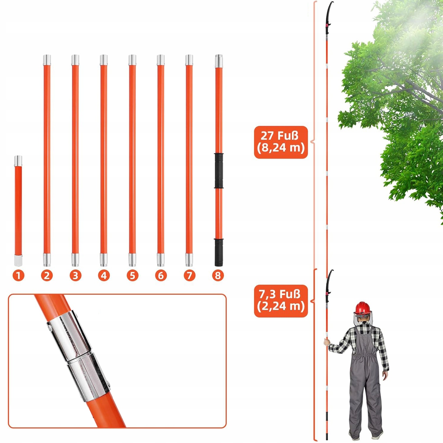 Набор ручного резки содержит 8 стержней и 2 алюминиевых лопасти и может быть отрегулирован на разных высотах от 2 до 8 метров в зависимости от потребностей.