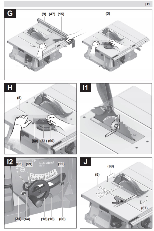 - (67) Винты с шестигранной головкой (5 мм) спереди для регулировки параллельности пильного полотна