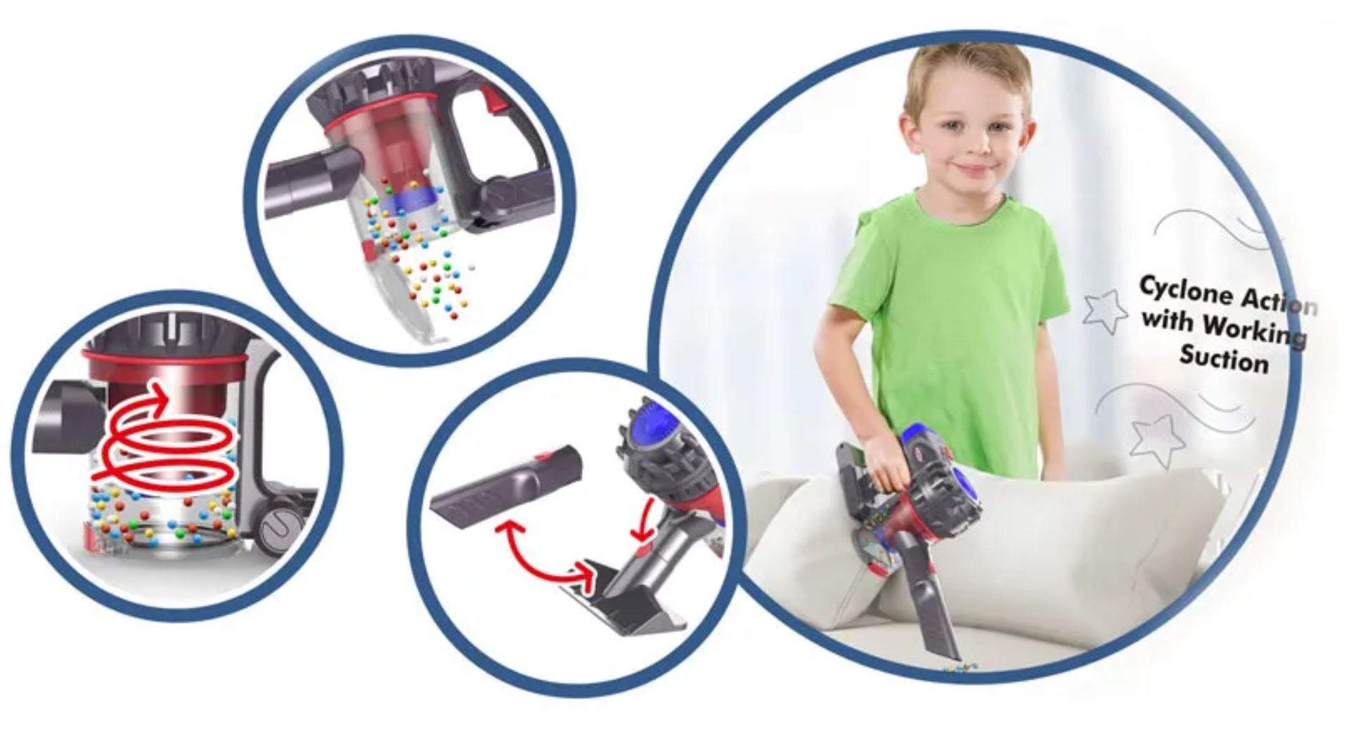 Игрушечный вертикальный пылесос серо-синего цвета с красными элементами. Оснащен функцией всасывания. У него есть съемный контейнер для мусора, который вы можете опорожнить самостоятельно.