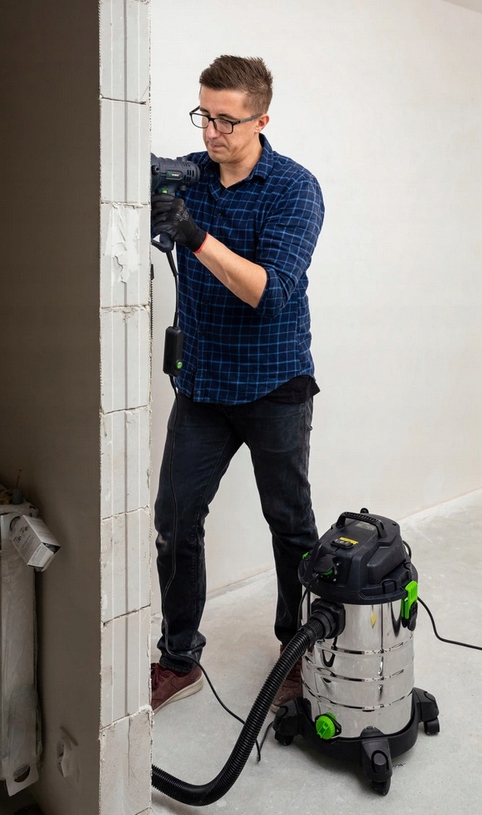 Пылесос оснащен розеткой для подключения электроинструмента, позволяющей синхронизировать работу приборов, и сменными рабочими насадками. позволяют эффективно очищать различные поверхности.