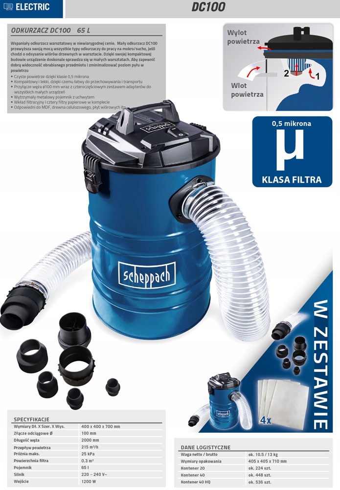 Просматривая «Пилосос Scheppach DC100, пилосос для майстерні, 65 л.», вы можете быть уверены, что данный товар из каталога «Вытяжка для опилок» будет доставлен из Польши и проверен на целостность. В цене товара, указанной на сайте, учтена доставка из Польши. Внимание!!! Товары для Евросоюза, согласно законодательству стран Евросоюза, могут отличаться упаковкой или наполнением.