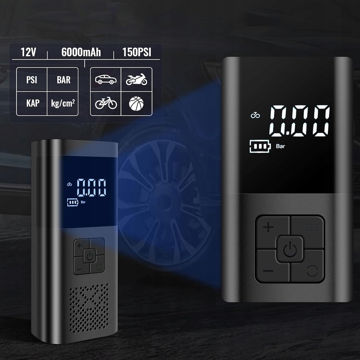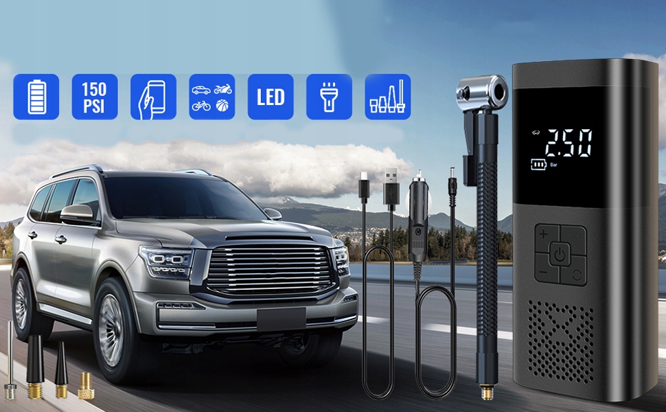 - Максимальное давление: 150 пс. кнопка/остановка/мощная питание/длительное время автономной работы/поддерживает зарядку мобильного телефона