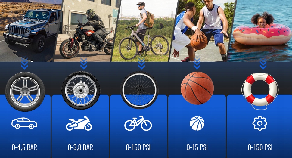 - Содержит 4 единицы измерения давления - psi, KPA, бар, кг/см. Давление в шинах, что облегчает выбор правильного метода перекачки