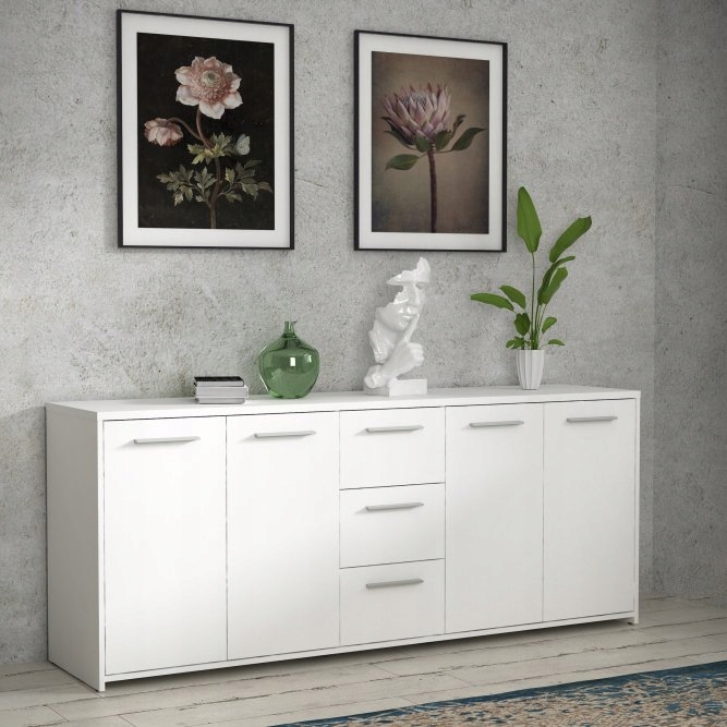 Белый комод шириной почти 180 см прекрасно подойдет в качестве элемента оборудования спальни или гостиной. Thanks to two large cabinets and 3 drawers, it provides functional space for storing everyday items. Нежный белый декор не только украсит интерьер, но и добавит ему стиля и элегантности.