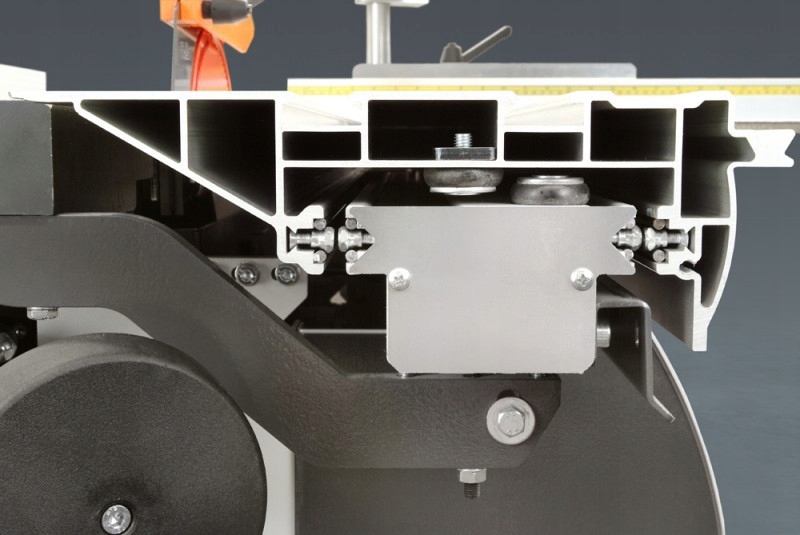 Поперечный стол с телескопической стрелой, оснащенный двумя массивными упорами, позволяющими обрабатывать очень большие заготовки.