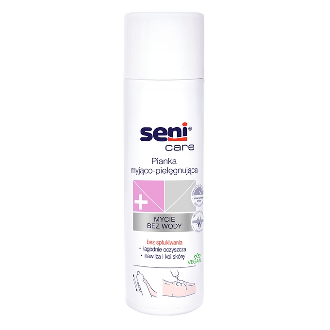 Пенка для умывания Seni Care – прекрасное средство для ухода за кожей пациентов, особенно тех, кто по состоянию здоровья не имеет возможности пользоваться туалетом. Это эффективное очищающее средство, позволяющее тщательно очистить организм без использования воды. Отсутствие необходимости полоскания облегчает уход за пожилыми людьми, постоянно лежащими, а также за маломобильными больными. Благодаря этому решению мы можем избежать хлопот с их транспортировкой в ванную, а ежедневный туалет можно выполнять прямо на кровати пациента. Пенка Seni Care основана на деликатных очищающих компонентах и не влияет на липидный барьер кожи. Содержащееся в нем оливковое масло в сочетании с сахаром бетаином оказывает увлажняющее действие, а пантенол прекрасно успокаивает раздражения. Препарат обогащен натуральным веществом, нейтрализующим неприятные запахи. Пенку можно использовать для интимной гигиены, кроме того она является веганским продуктом и не содержит ингредиентов животного происхождения.