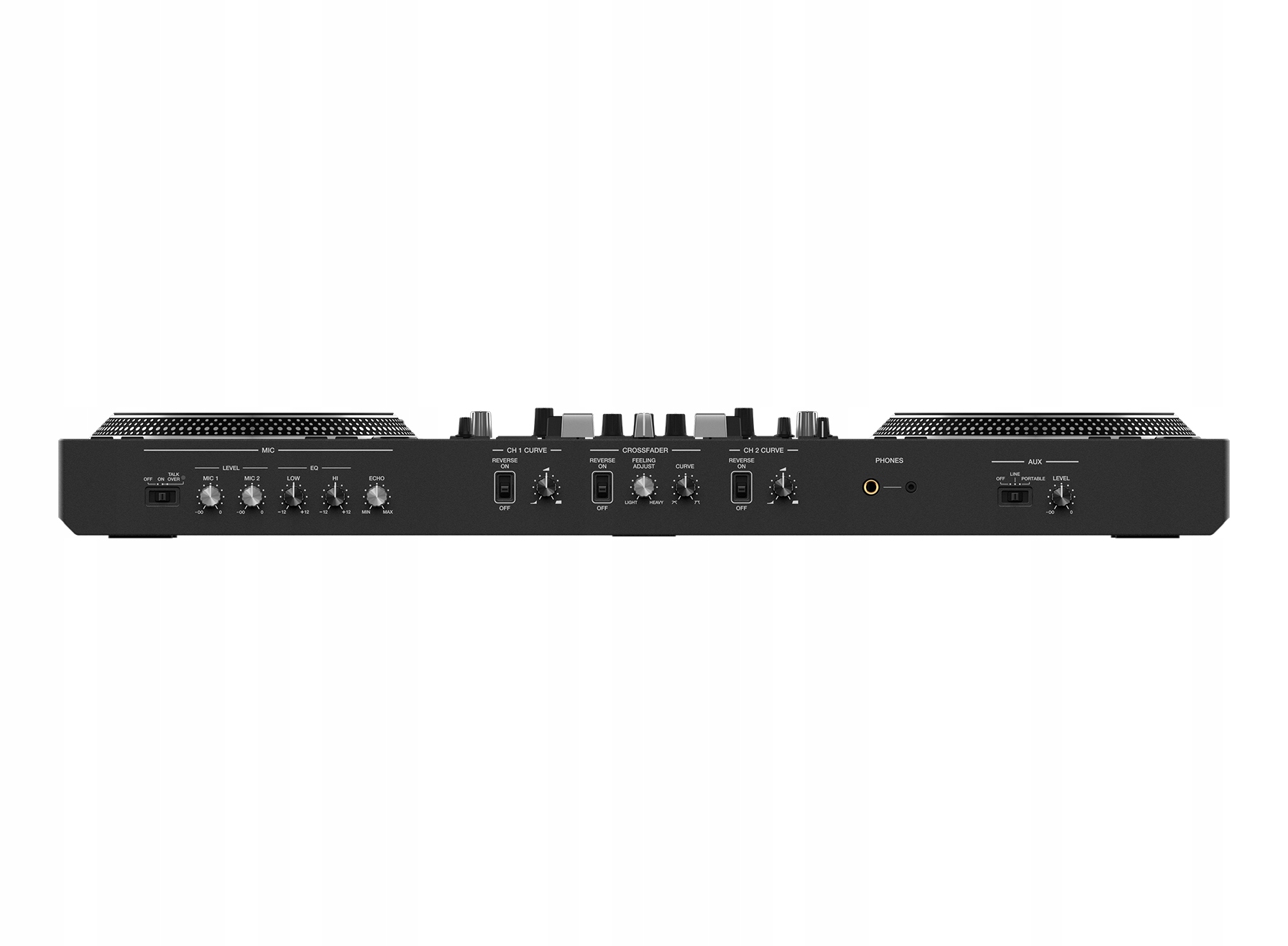 DDJ-REV7 прочный и долговечный, но при этом достаточно легкий. чтобы поднять его за ручки на корпусе и отнести на следующую вечеринку. Контрастная матовая и матовая алюминиевая отделка на верхней панели позволяет визуально разделить секции деки и микшера, делая компоновку традиционной, состоящей из 2 проигрывателей + микшер. А дисплеи на джогах выглядят как этикетки посреди виниловых пластинок.