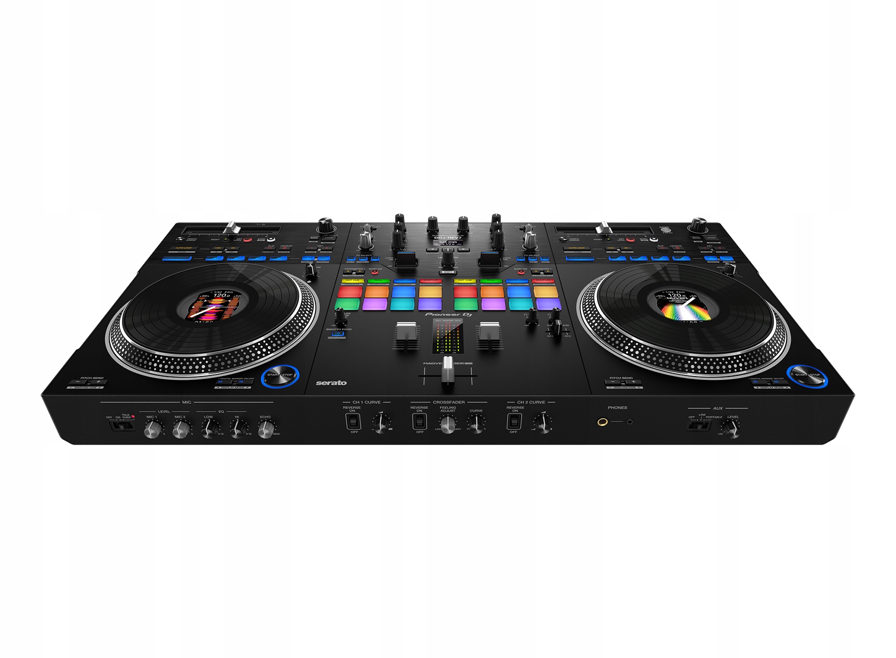 Pioneer DJ представляет автономный DJ-контроллер DDJ-REV7 с моторизованными колесами JOG, а также боевой скретч-микшер с программным обеспечением и двумя USB-картами для Serato DJ. Новый DDJ-REV7 предлагает две деки с новыми 7-дюймовыми моторизованными колесами JOG со встроенным OLED-дисплеем, позволяющим считывать обложку песни и форму волны, а также потенциометры высоты тона, установленные в боевом стиле, и элементы управления для выбора диска, высоты тона и песни. Контроллер предлагает 33⅓ или 45 об/мин и использует функцию Stop Time, чтобы настроить время, по истечении которого музыка выключится после нажатия паузы.