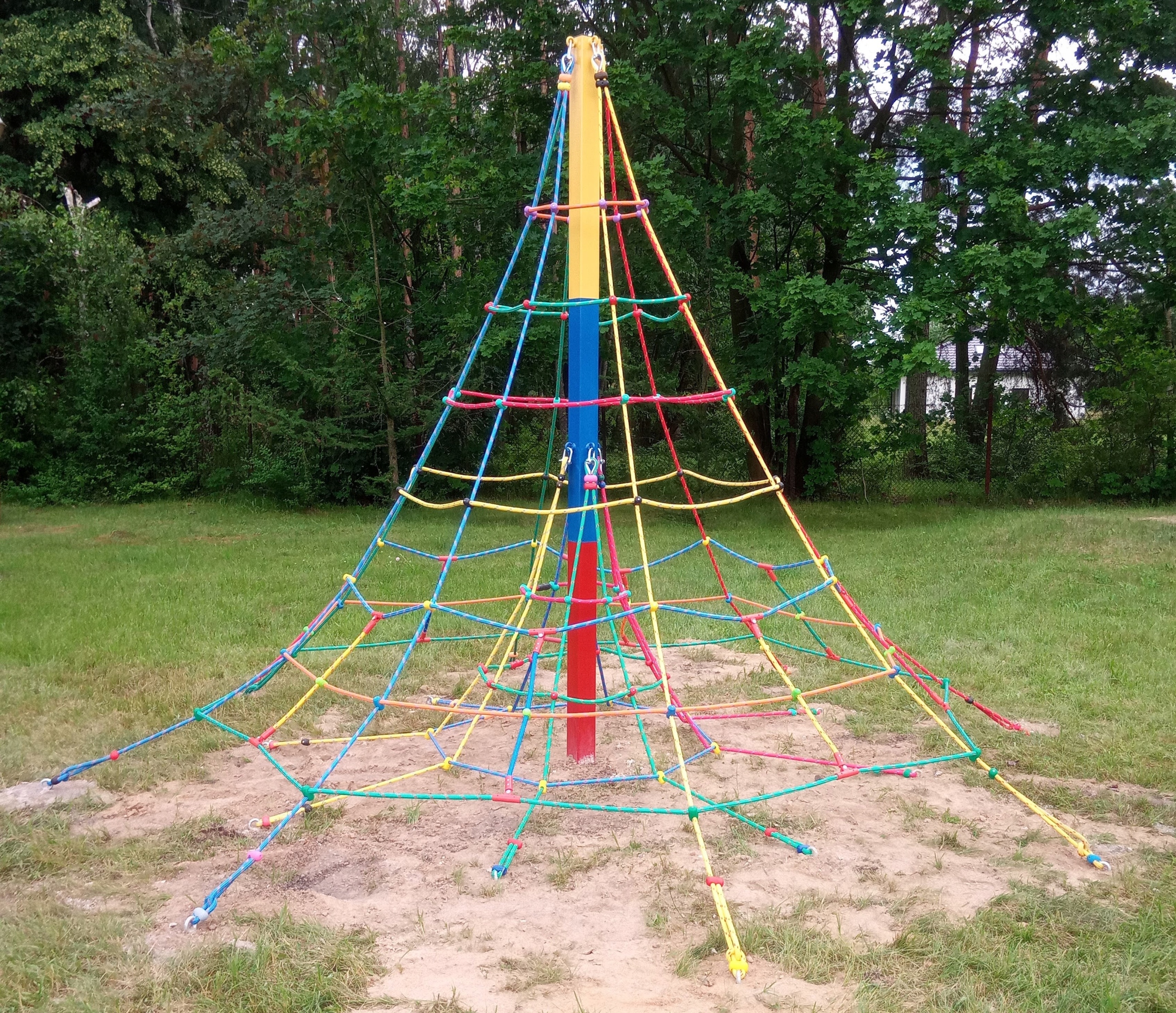 Веревочная конструкция для лазания в форме пирамиды. Толщина каната 16 мм в расчете на восьмиугольник, высота 3,1 м, диагональ основания 4,6 м. В комплект входят веревки, пластиковые соединительные элементы и 4 металлических коуша (верхнее крепление). Цвета веревок могут отличаться от представленных на фото.