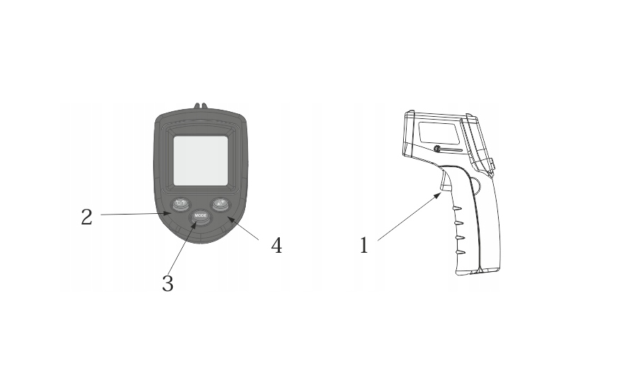(2,4) Кнопка изменения единиц измерения между градусами Цельсия и Фаренгейта. Кнопка также используется для уменьшения значения в режиме регулировки коэффициента излучения и ручной калибровки.