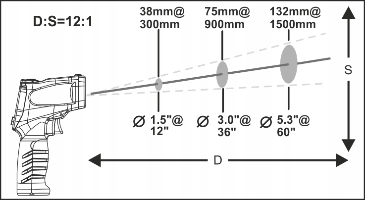 Размер точки измерения меняется с расстоянием в соотношении 12:1