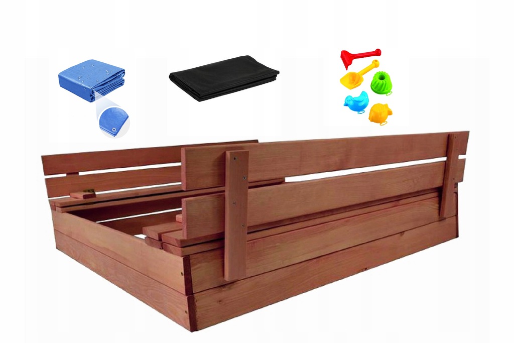 - Песочница с практичной системой закрытия, ее можно быстро трансформировать в две скамейки.