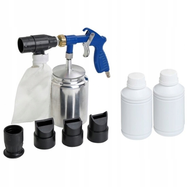 ПРЕДНАЗНАЧЕН ДЛЯ РАБОТЫ С БОЛЬШИНСТВОМ АБРАЗИВОВ ДИАМЕТРОМ ДО 1,4 ММ. БЛАГОДАРЯ ЧЕТЫРЕМ РАЗЛИЧНЫМ НАСАДКАМ МЫ МОЖЕМ РЕГУЛИРОВАТЬ ФОРМУ ПОТОКА. ВОЗМОЖНО ВОССТАНОВИТЬ АБРАЗИВНЫЙ МАТЕРИАЛ ПРИ ПРИЖИМЕ ГОЛОВКИ ПИСТОЛЕТА К ПЕСКОСТРОЙНОМУ ЭЛЕМЕНТУ. ОН СОБРАН В СУМКУ ДЛЯ МАТЕРИАЛА. ТАКЖЕ В КОМПЛЕКТ ВХОДИТ АБРАЗИВ: КОРУНД 850Г РАСХОД ВОЗДУХА: 200 Л/МИН. РАБОЧЕЕ ДАВЛЕНИЕ: 3,5 - 5 БАР ПОДКЛЮЧЕНИЕ ВОЗДУХА: 1/4" ВМЕСТИМОСТЬ БАКА ДЛЯ АБРАЗИВА: 1 КГ